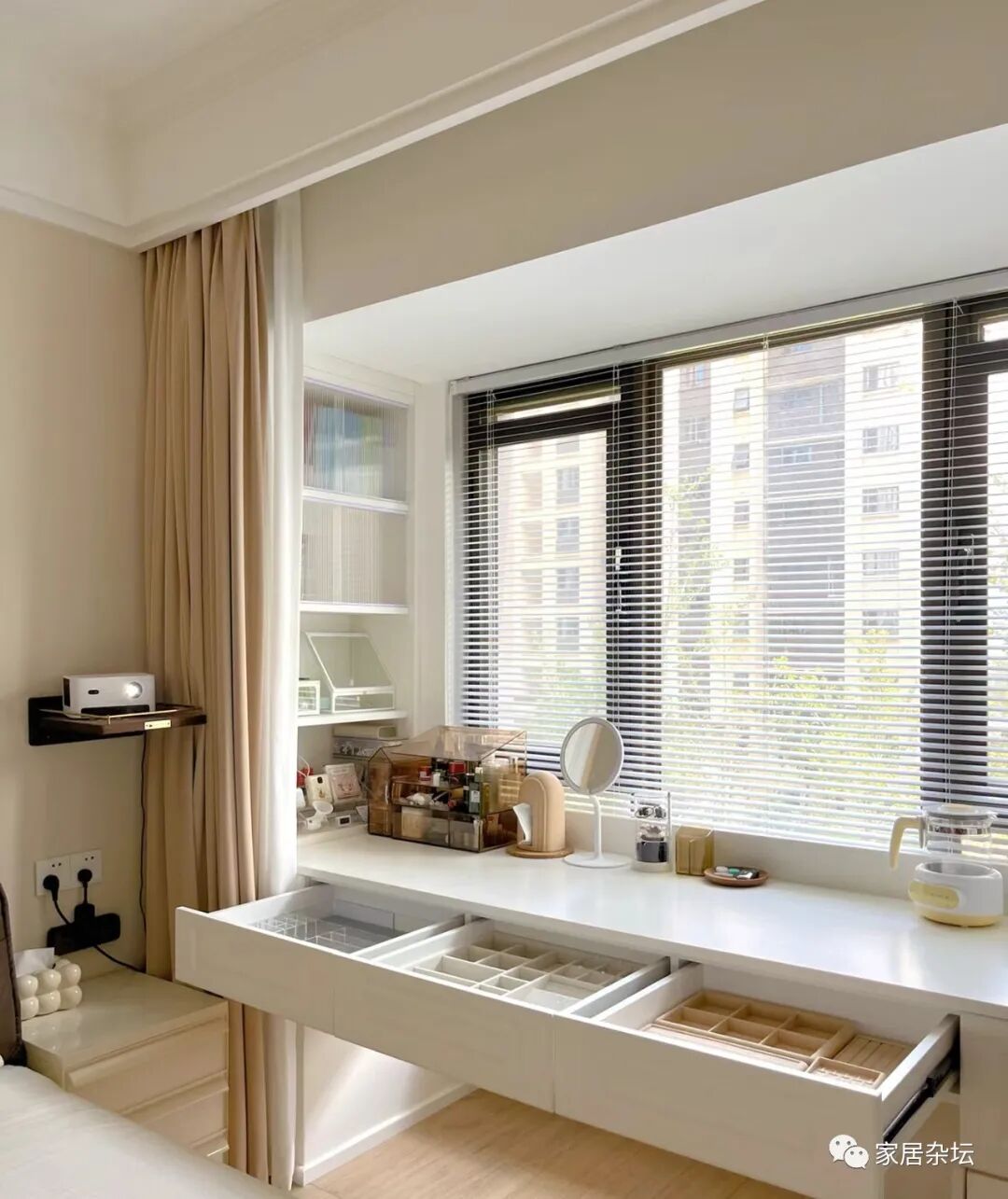 家里装修的时候,要考虑我们家里人使用的情况。对于有女性,而且特别喜欢化妆的,那么飘窗无疑是一个很好的地方。