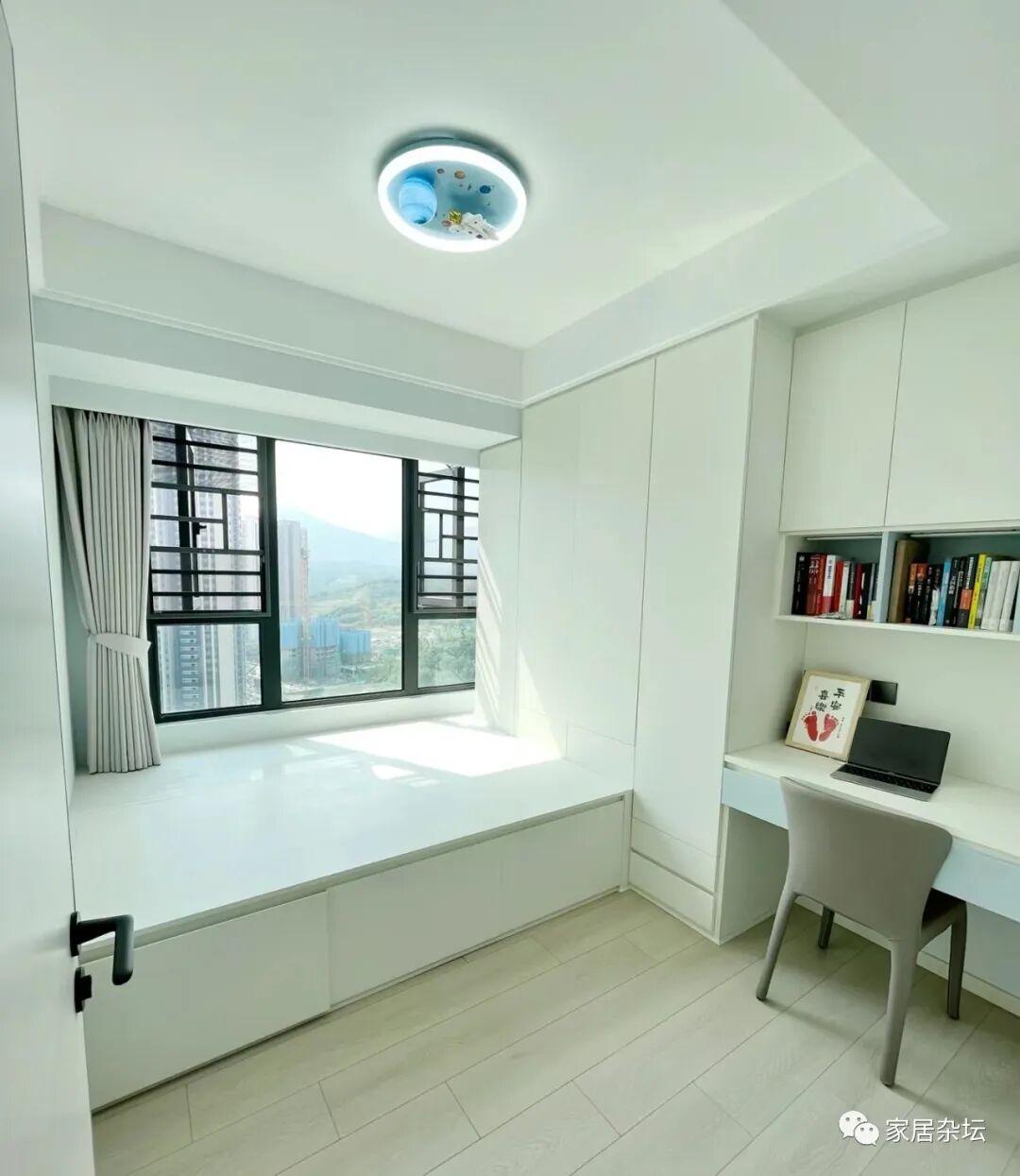 利用飘窗的书桌+书柜设置成学习区,可以实现以下的好处: