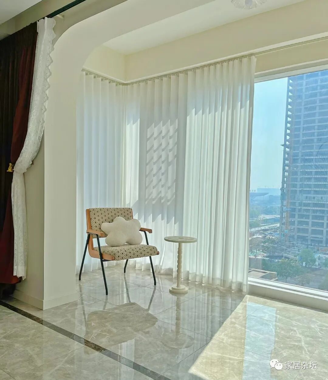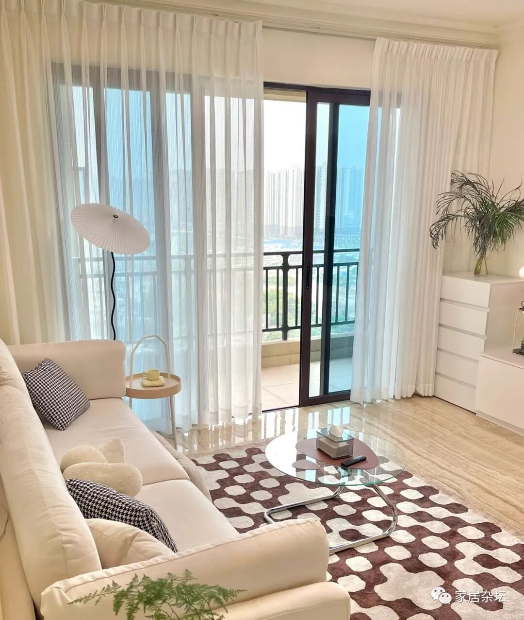 ②、客厅和阳台通透效果差。特别是现在我们大多数会采取通铺瓷砖,从客厅直接通铺到阳台,如果拉上窗帘的话,你会发现不是那么通透,看着也不舒服。
