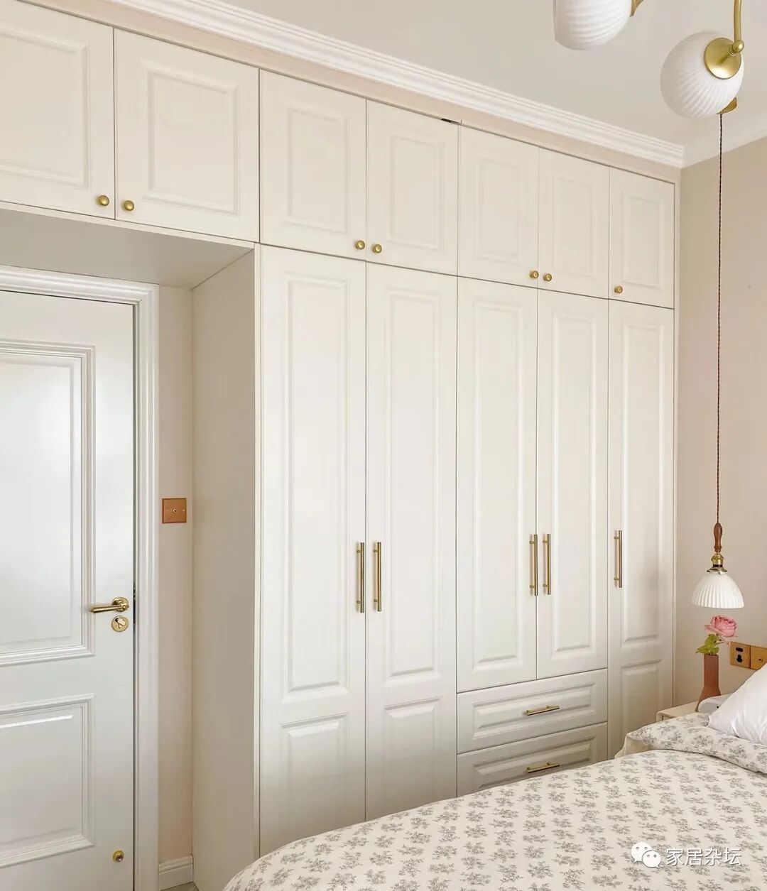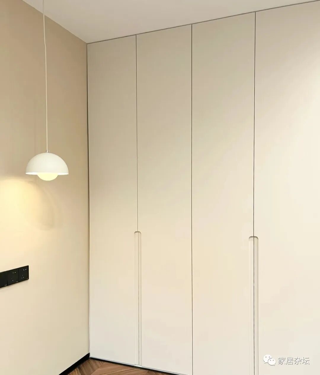 ①、一门到顶的衣柜。也就是说我们家里的衣柜,把柜门做到顶,整体效果更好,而且收纳能力更强,是目前的主流。