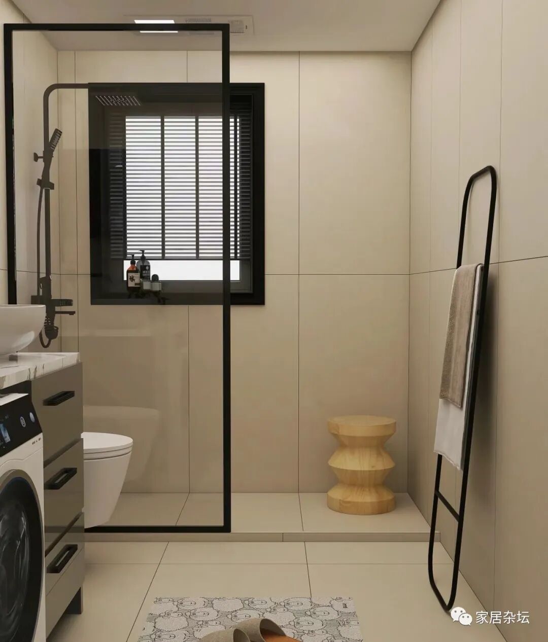 ②、做完全意义上的干湿分离。这时一般是把洗脸盆放在卫生间门口,这样我们使用洗脸盆的时候,和洗淋浴可以同时进行,互不干扰。
