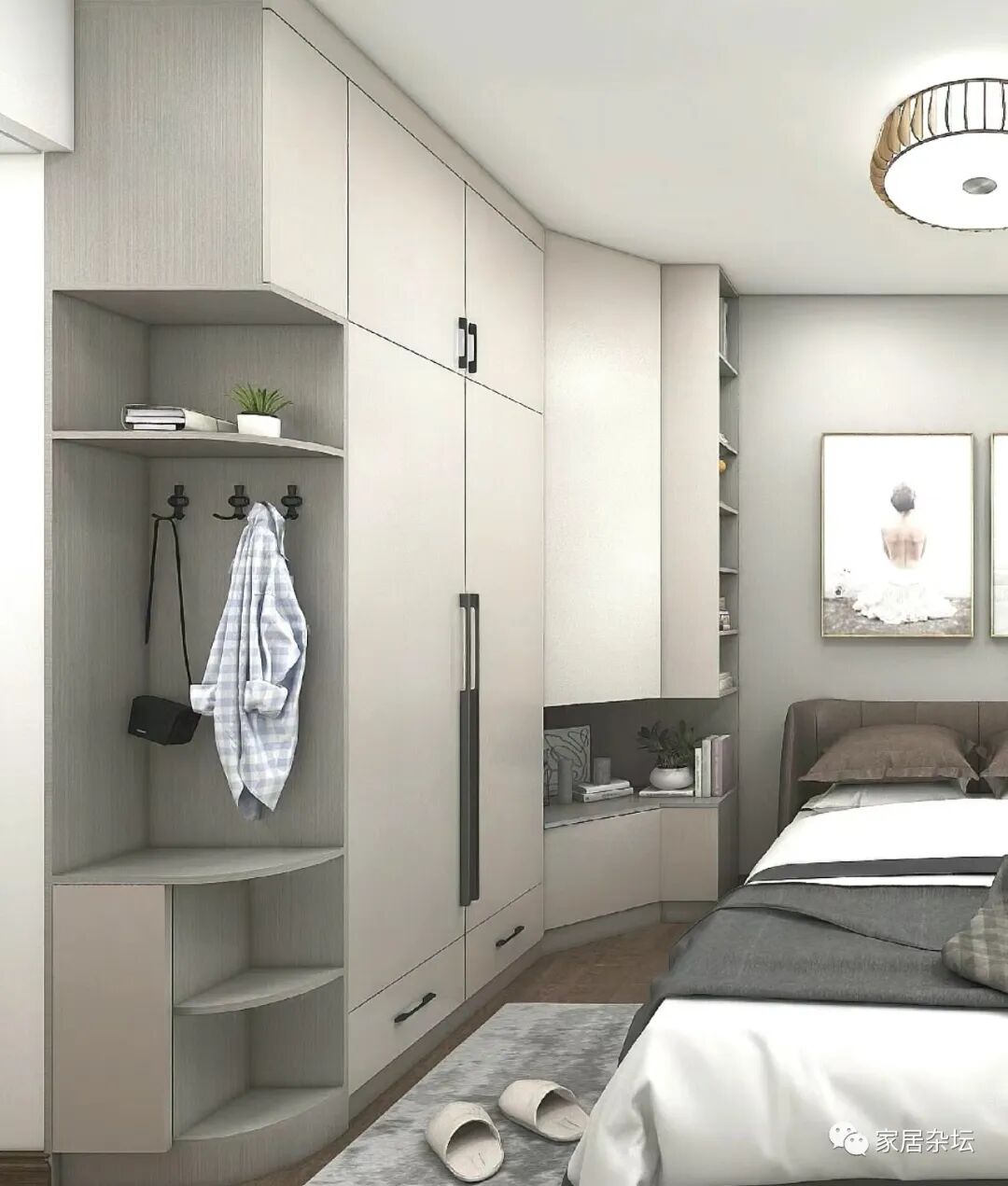 ①、定制衣柜来代替圆弧转角衣柜。所谓的定制衣柜,是根据我们卧室整体的尺寸布置来定制一门到顶的封闭式衣柜,效果会更好。