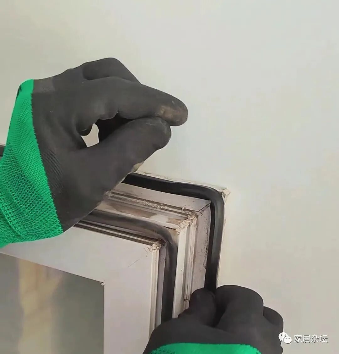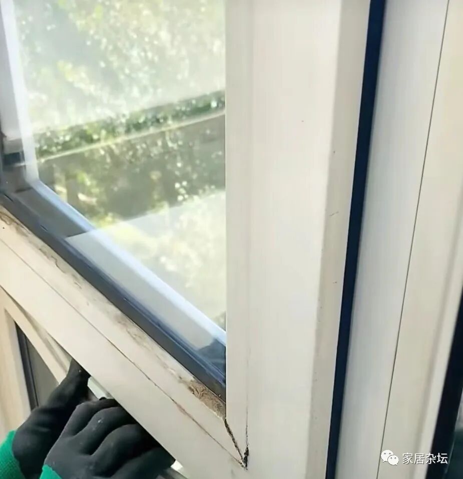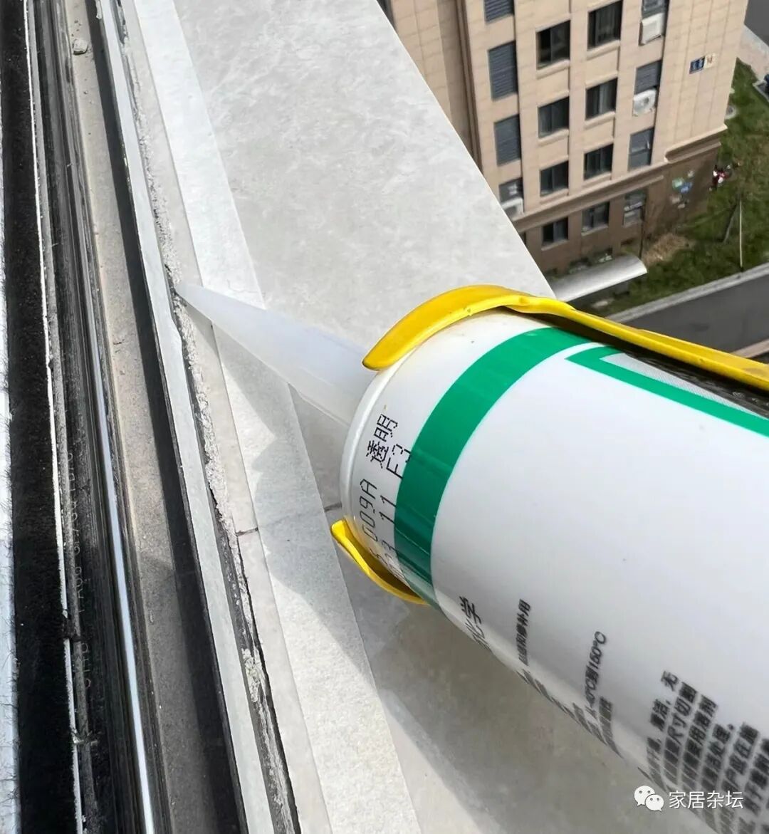 ②、处理玻璃胶。当我们发现窗户外面的侧边玻璃胶开裂,或者是开胶等,都要进行重新处理。这里是建议大家将窗户外面的玻璃胶重新打一遍。做法是拆掉原先所有的玻璃胶,补打密封胶之后,再重新打玻璃胶。