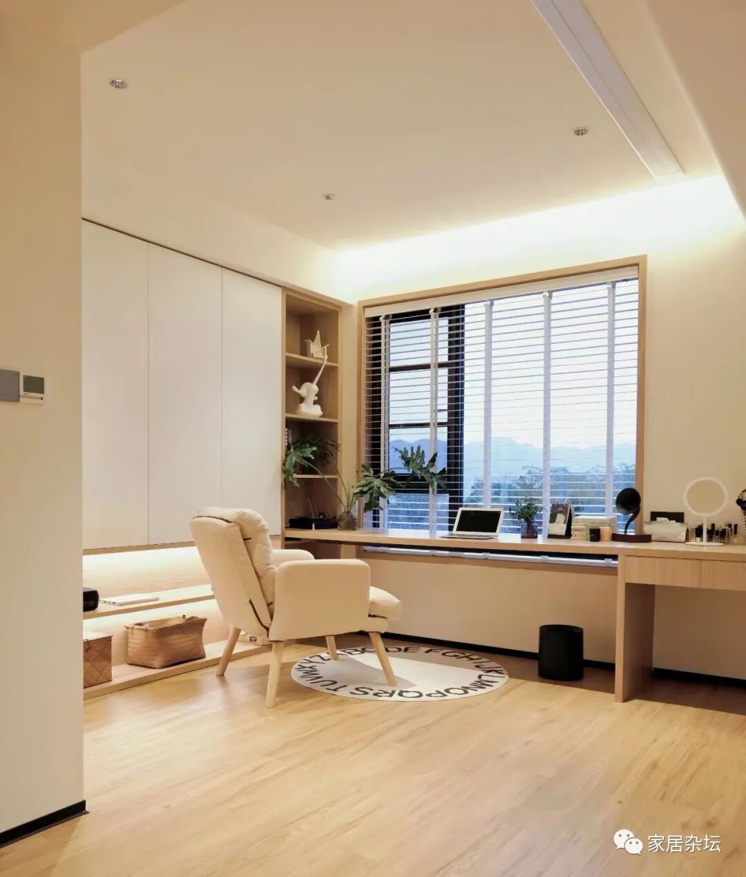 ①、卧室,建议以功能主义为主,实现极简的生活格调。所以,一般建议大家木地板配上通顶柜,不失为好的装修方案。