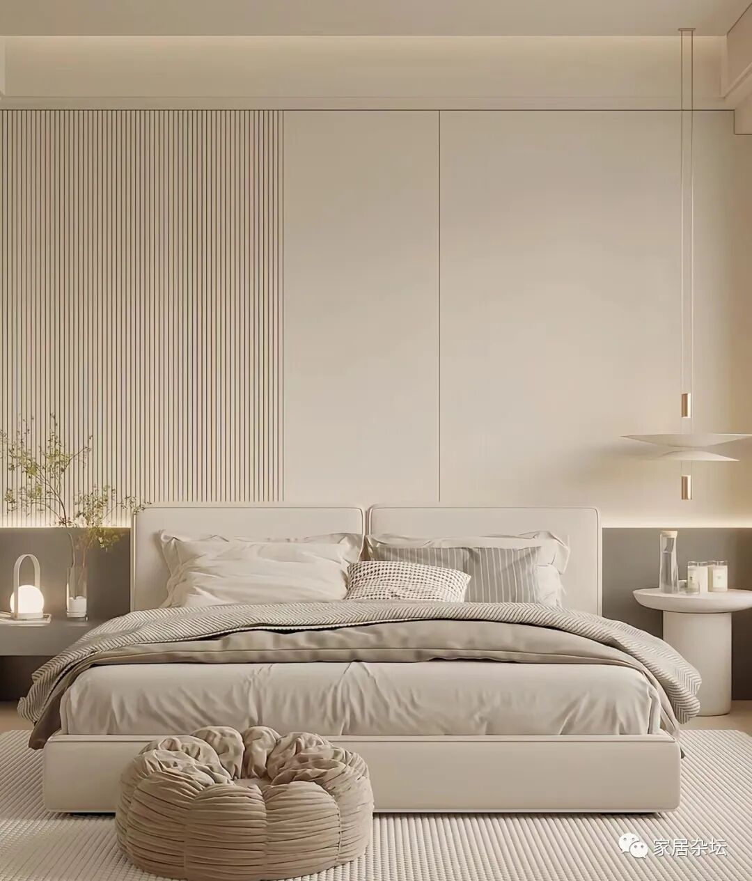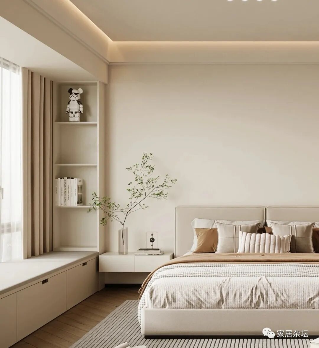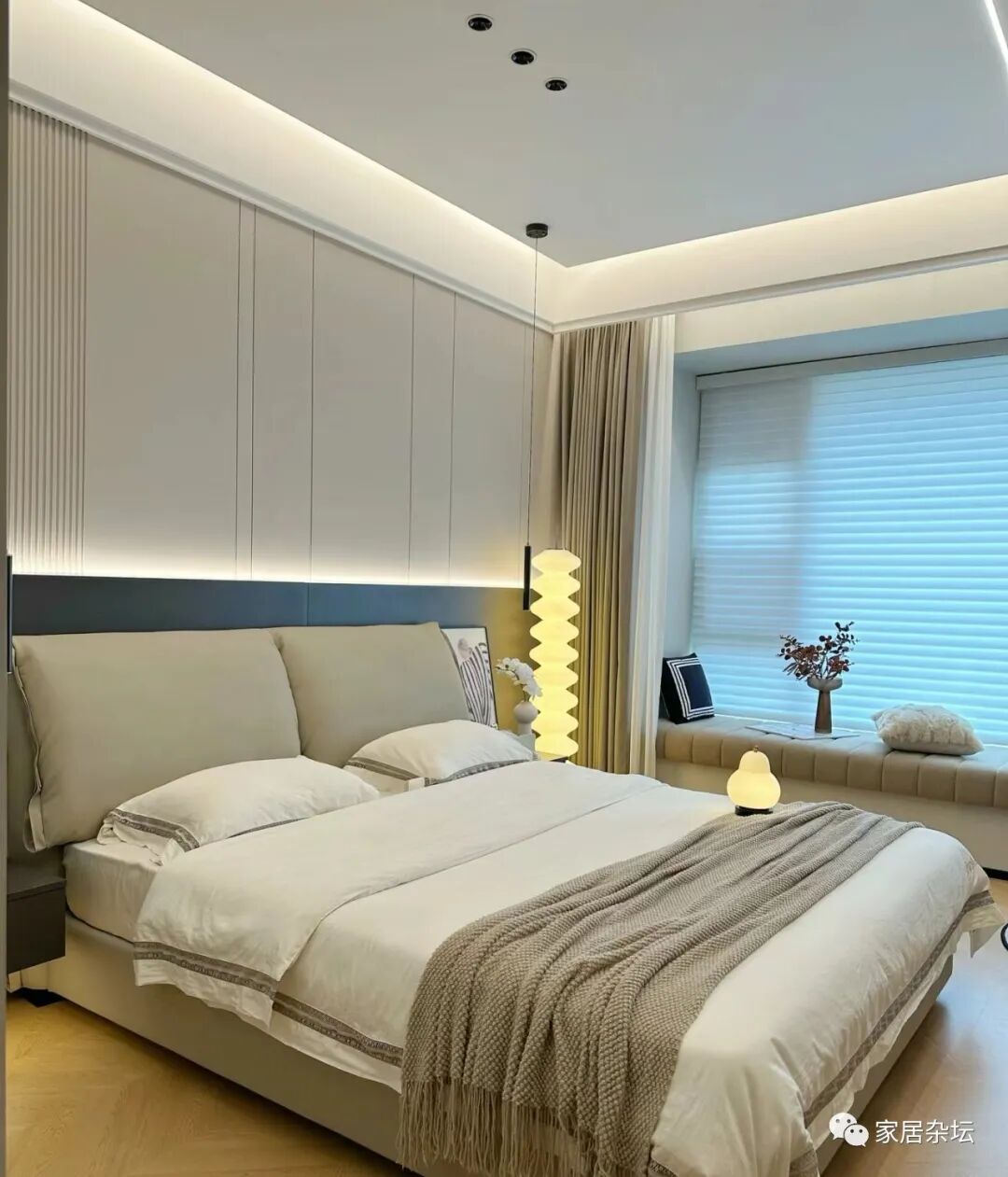 ④、取消床头柜。让床的两边自然空出来,不仅好打理,而且更显得干净整洁。当然,要提前考虑床头柜的收纳。