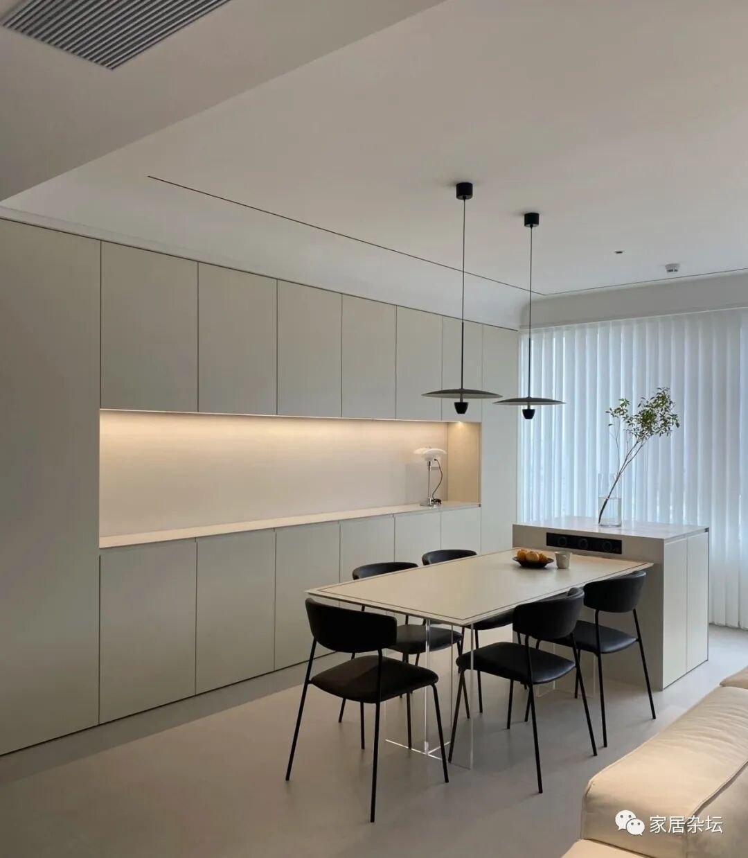 ①、对于极简装修的餐厅,个人建议大家采取隐藏式餐桌。餐桌与餐边柜是一体的,不用的时候可以收进餐边柜中,看着非常的简单。