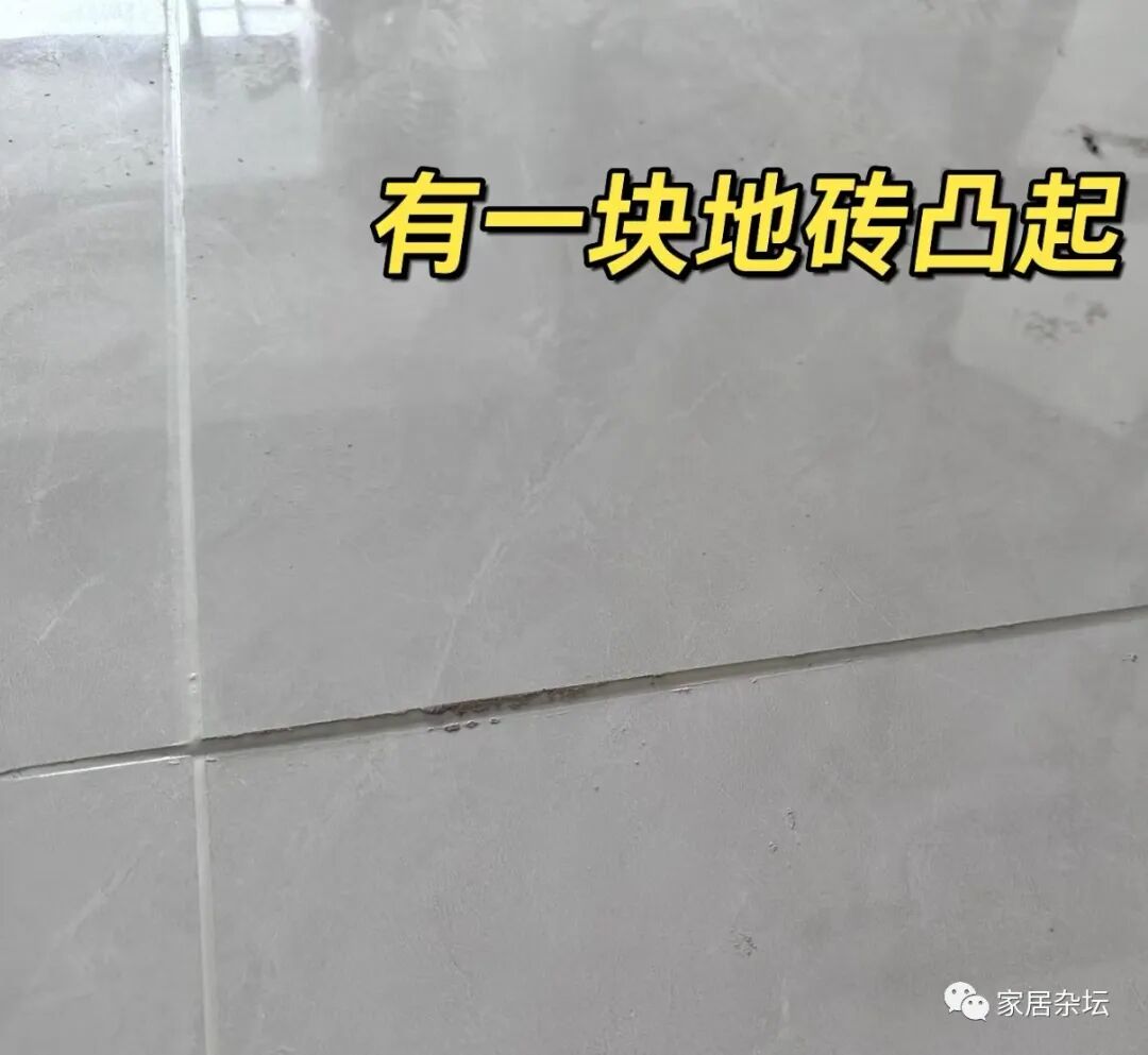 ②、局部瓷砖翘起。其实,这也是瓷砖空鼓比较严重的一个情况。我们看到的就是两块瓷砖之间顶在一起,然后瓷砖向上拱起了。