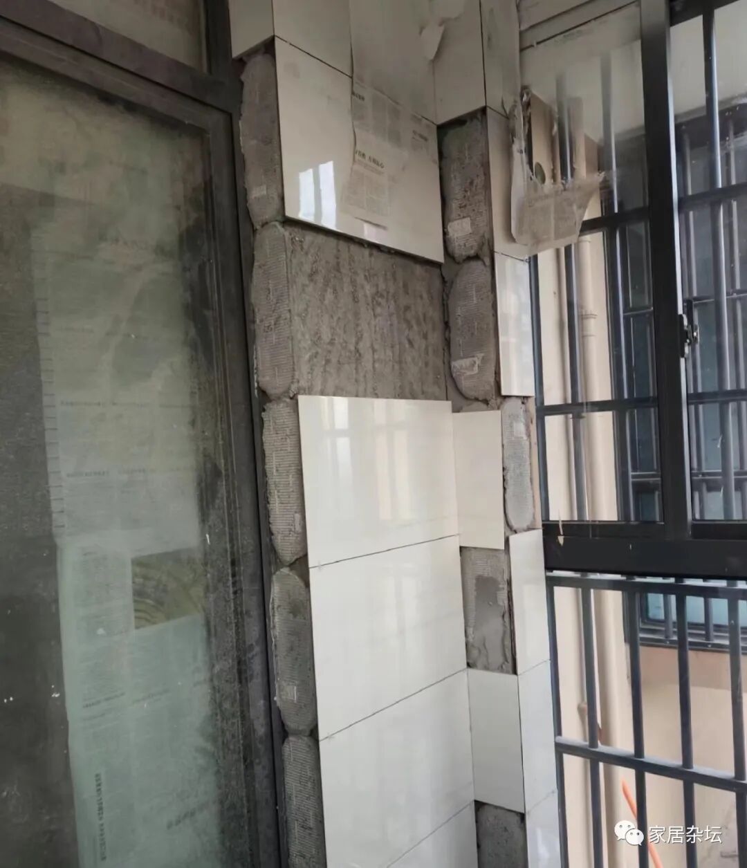 ②、阳台墙面第二种常见情况,就是把保温层铲除以后粘贴瓷砖。但是铲除以后,没有很好的处理墙面,直接粘贴瓷砖,导致粘不住。