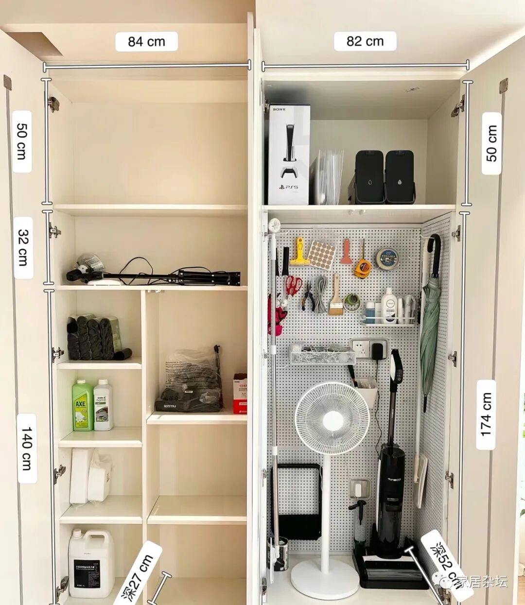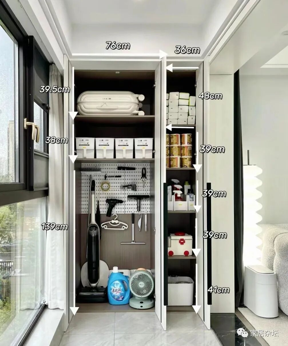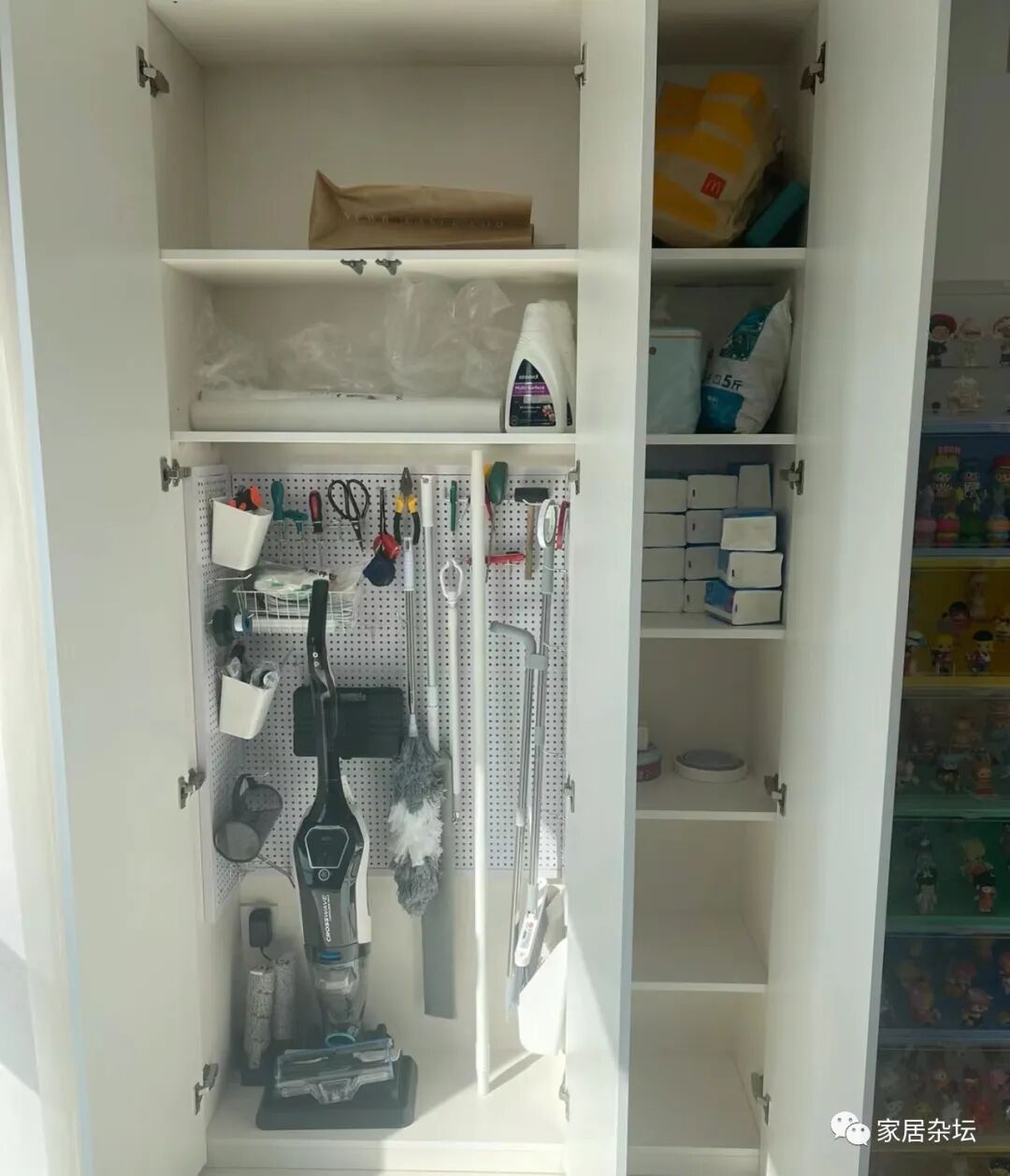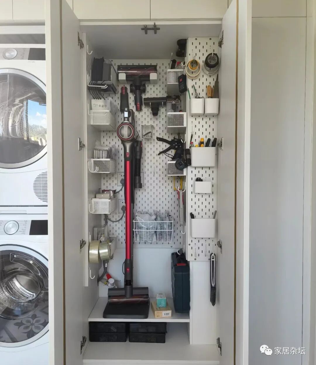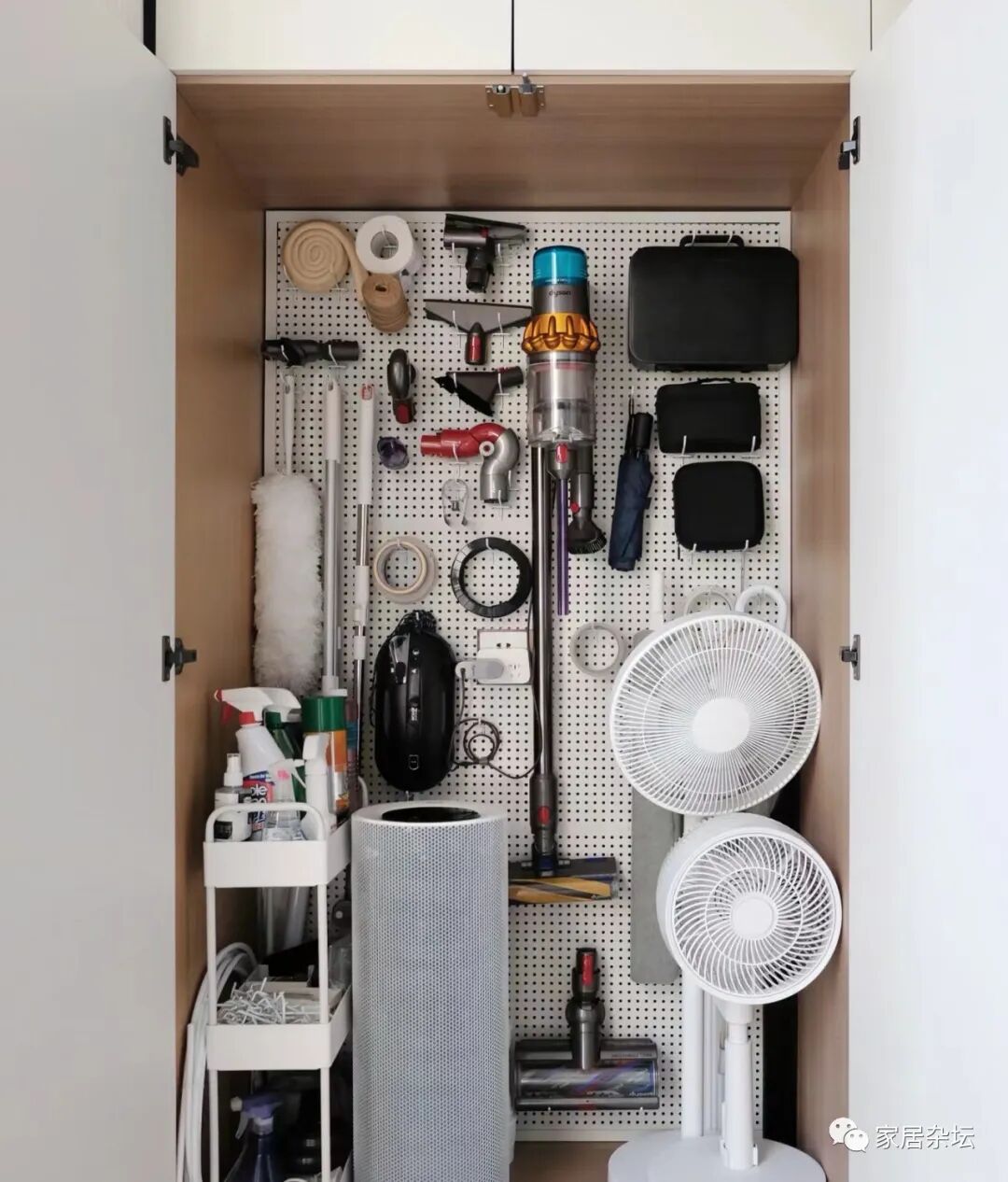 ①、家中所有的手持的工具,几乎都可以挂在收工具柜内。无论是我们的手持电钻,吸尘器等,都可以收纳在工具柜里。