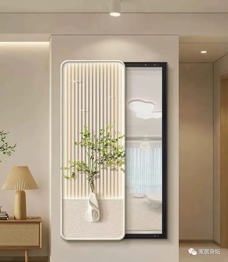 ②、隐藏式墙面试衣镜。这类试衣镜的安装方法,就是把镜子安装在某个墙面上,但是镜子的表面是使用了类似于装饰画来进行了遮挡,进行了隐藏。