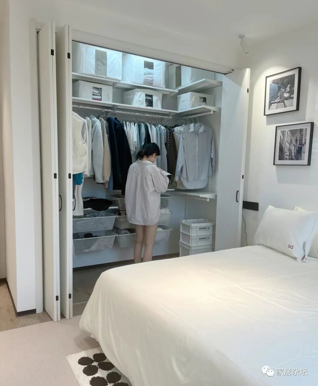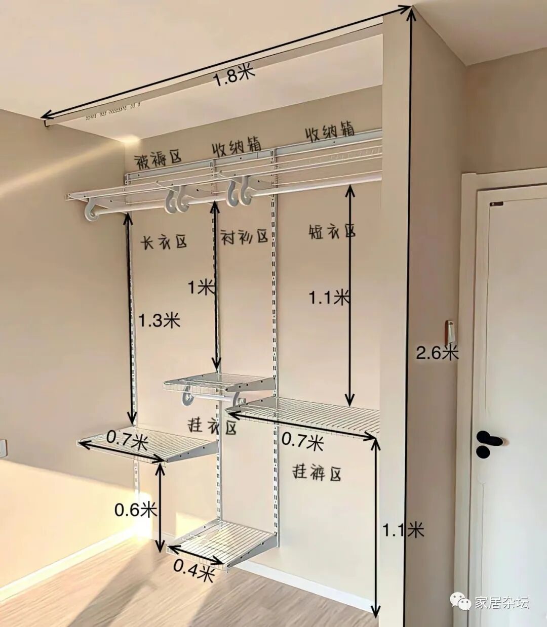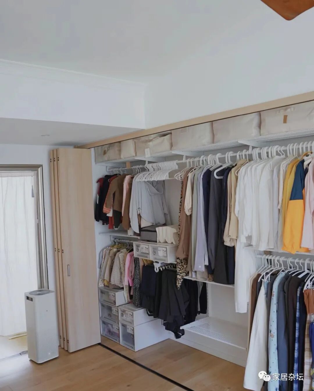 ①、在衣柜的旁边,预留长度1米,宽度40~50公分的一个空间。这个空间就可以用来摆放一个开放式的晾衣架,每天用来挂衣服。