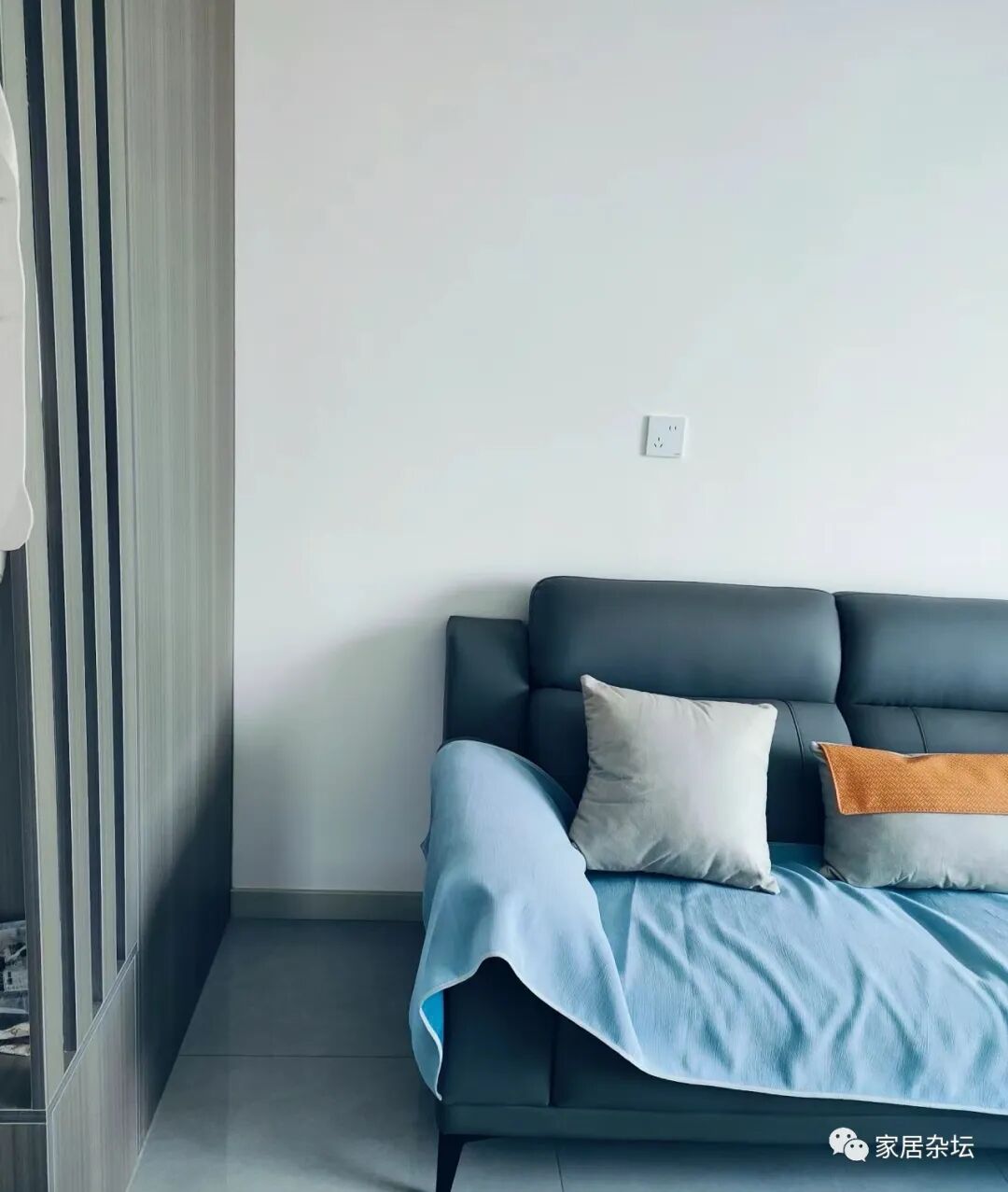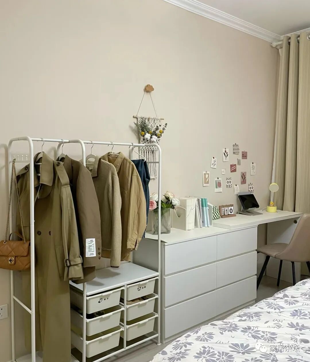 ②、床和墙体之间,如果空间允许的话,同样也可以预留这个空间。例如我们的床头柜的位置,其实有时候可以预留一个开放式的晾衣架的位置,也是不错的。