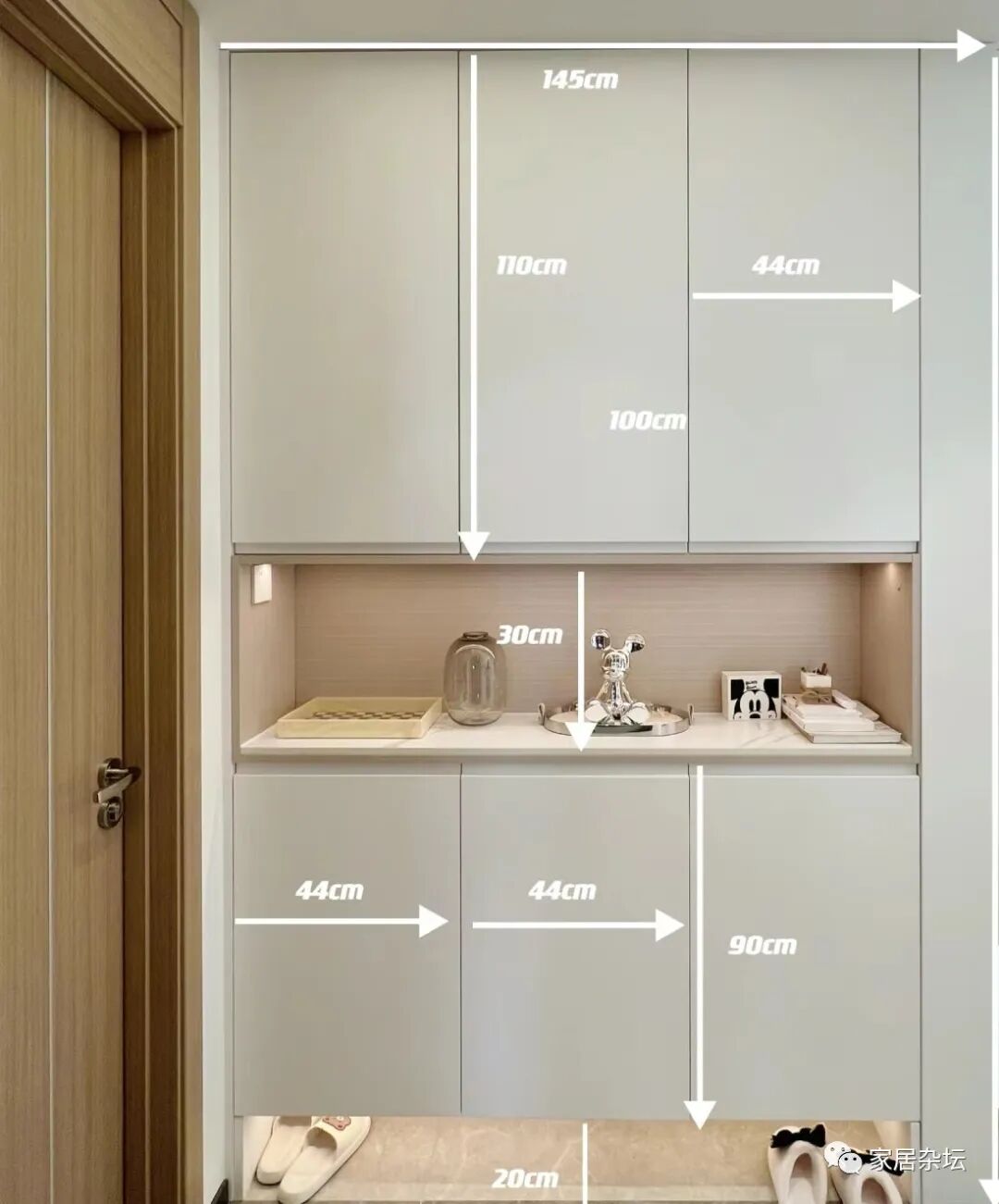 ①、高度的确认。其实对于鞋柜底部,建议大家留20公分,这样扫地机器人可以轻松进入。而且,对于大部分鞋来说,都可以推进去。
