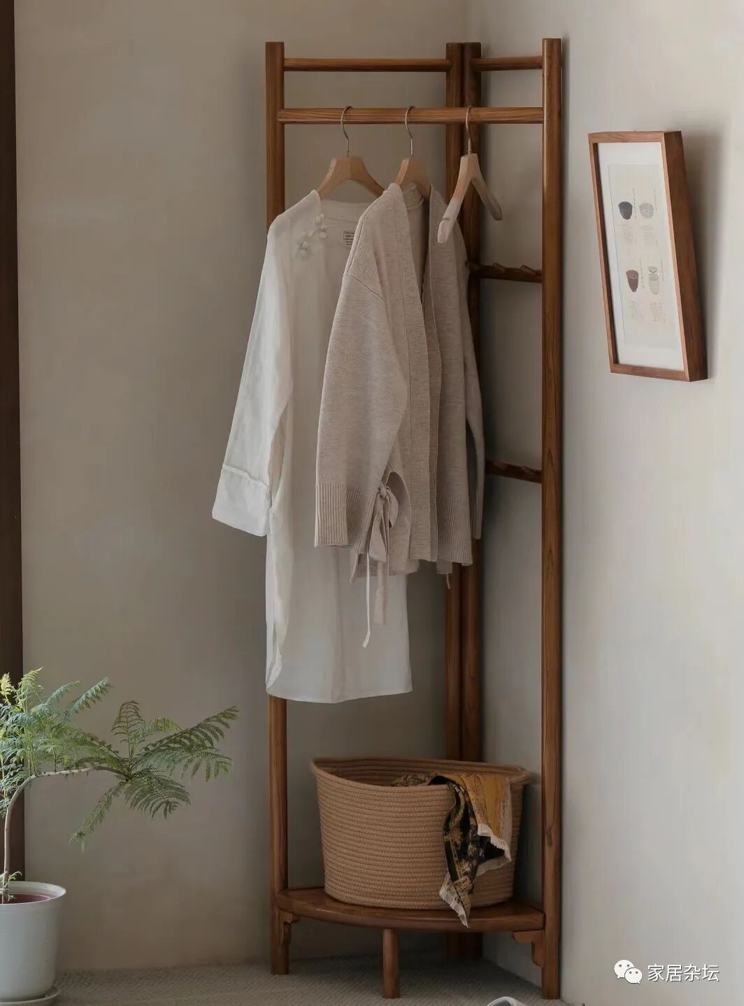①、开放式的晾衣架,可以挂得下几乎所有经常穿的衣物。每天出门所穿的衣服,回来换下来,都可以挂在晾衣架上。