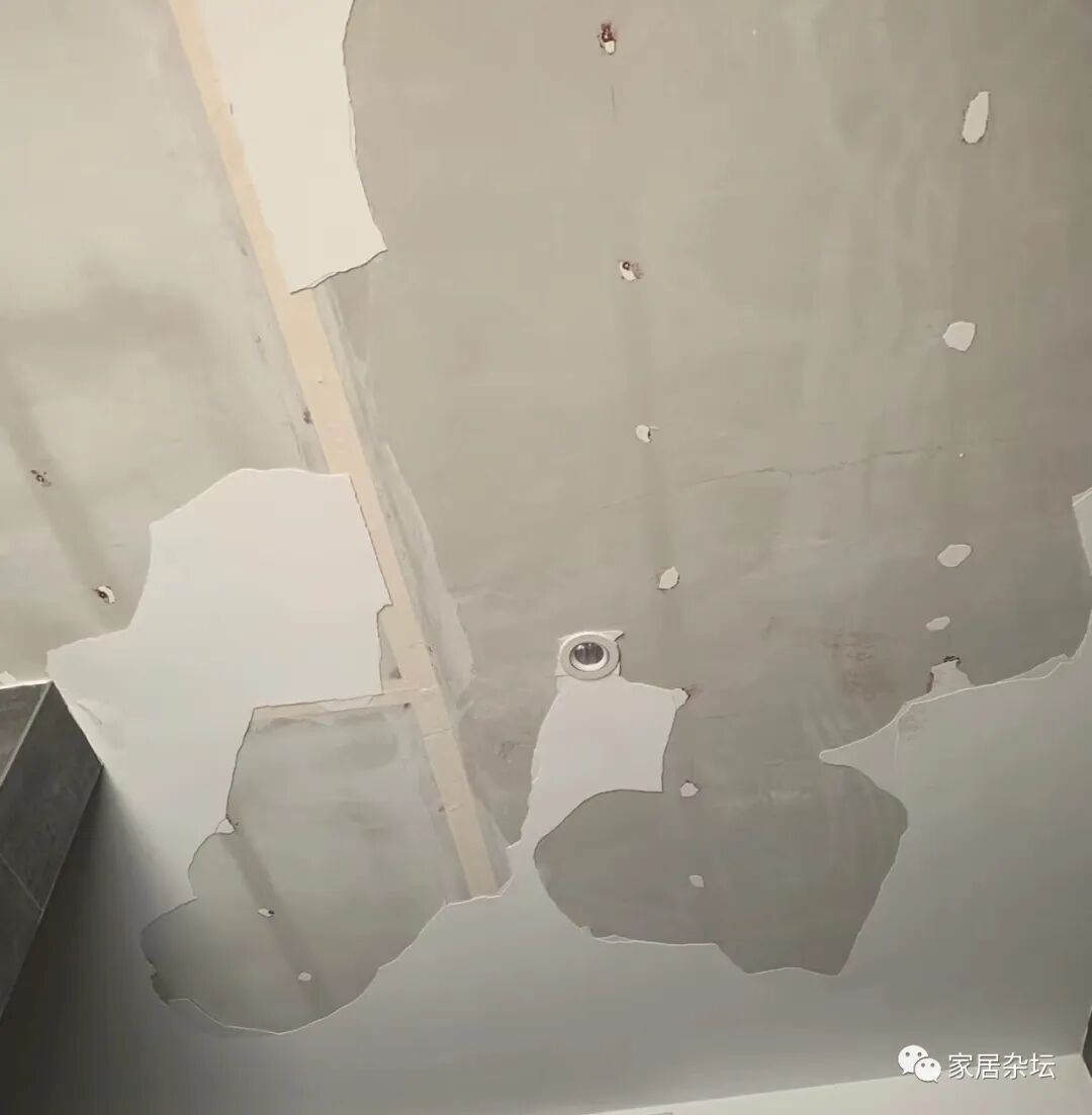 ③、石膏板吊顶被水浸泡以后,就完全坍塌了。如果是楼上卫生间漏水,滴落到下面,你会发现你家的顶子就被泡透了,只能拆了重做。
