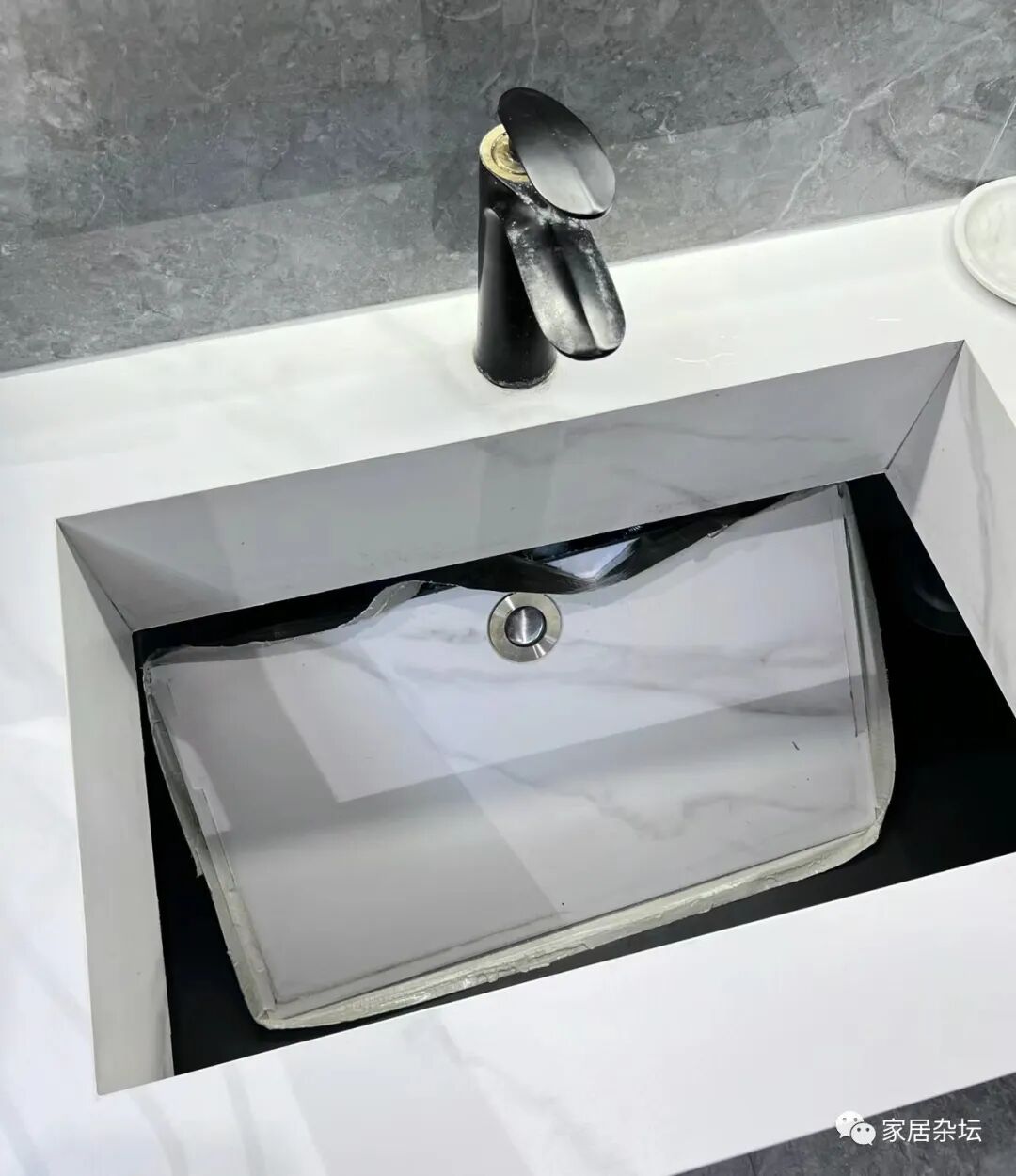 ②、如果我们特别喜欢岩板,那么可以选择岩板的台面,陶瓷的盆体。只是需要注意盆体和台面之间要有的可靠的加固方式,而不能只是胶粘的。