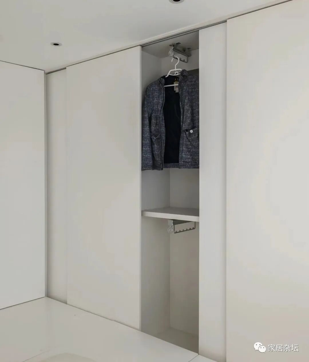 ③、柜门开启,没有任何遮挡的时候,也是首选推拉门的衣柜。因为有些设计,把衣柜和其他的布置分开,那么这种情况下,衣柜就可以任意选择了。