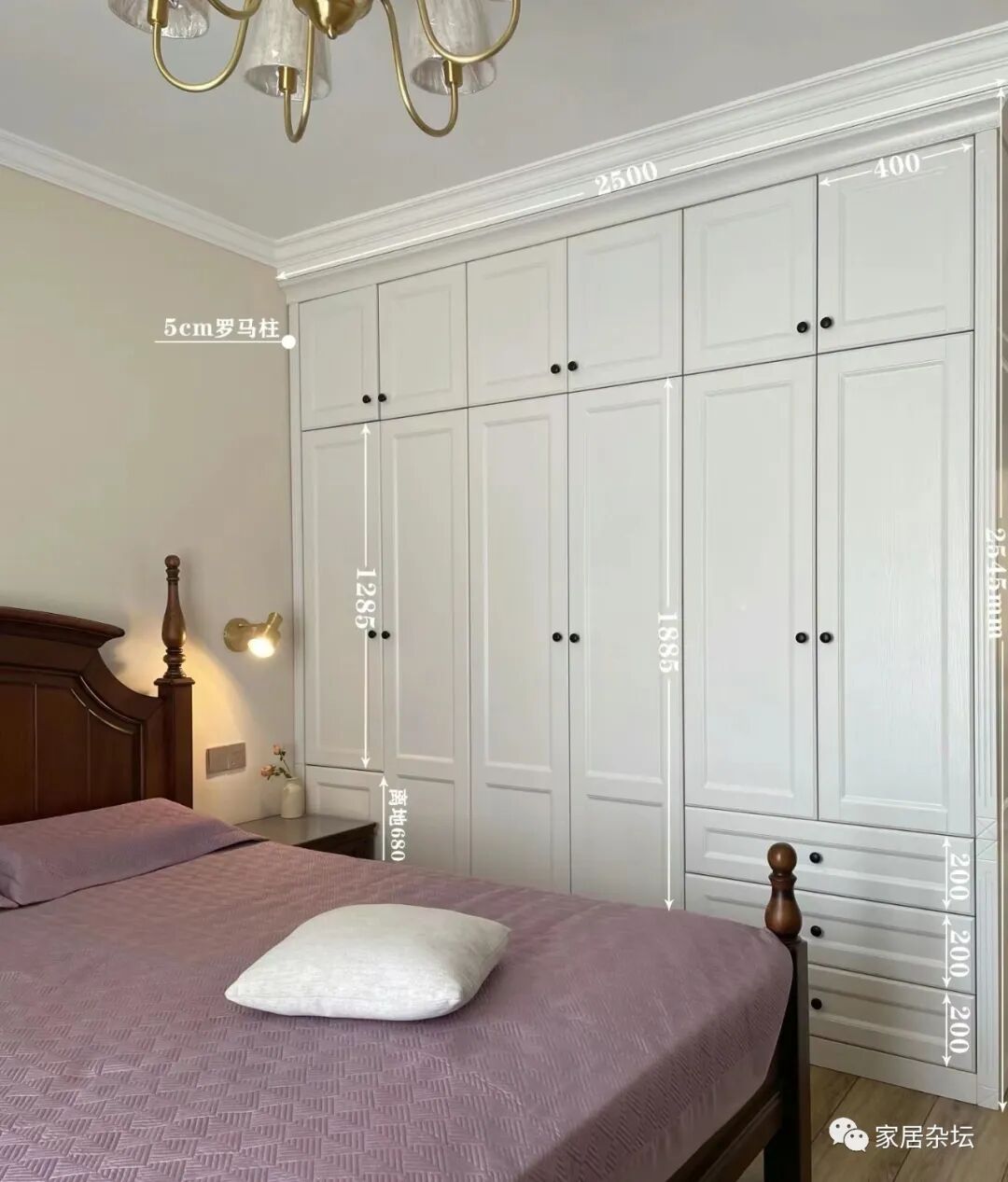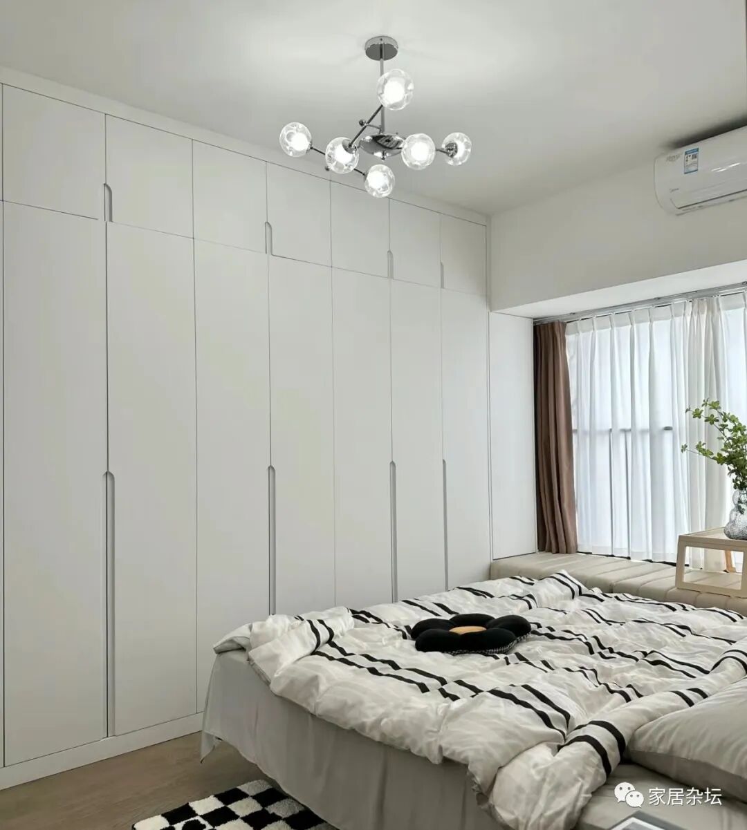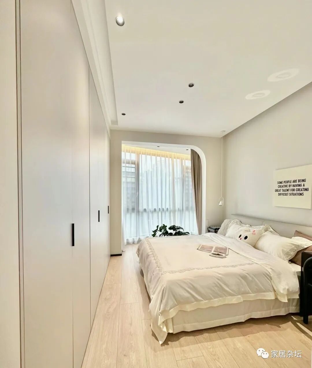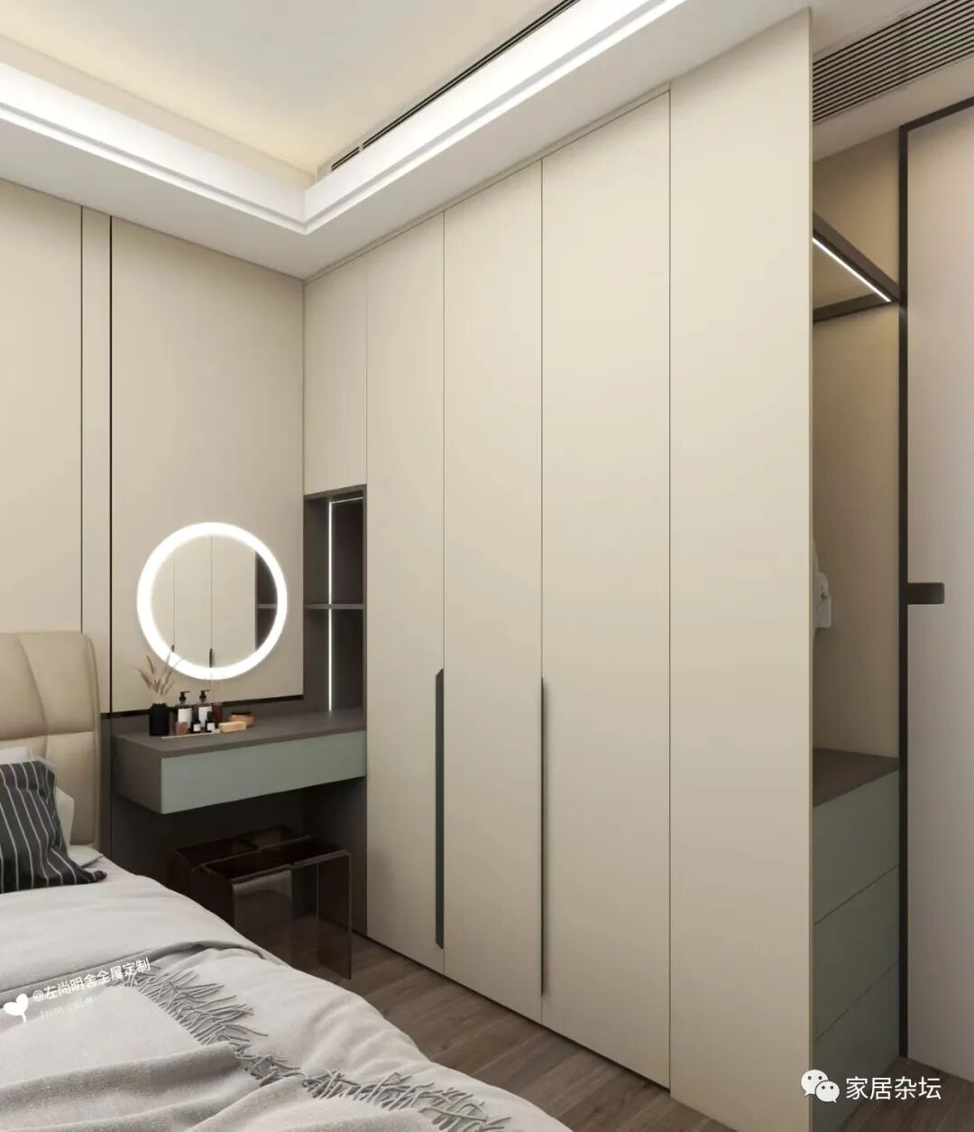 ③、如果我们家里床头柜与衣柜之间距离过近,可以考虑特殊做法。例如可以选择推拉门或者是将床头柜的位置让出来做成异形门。