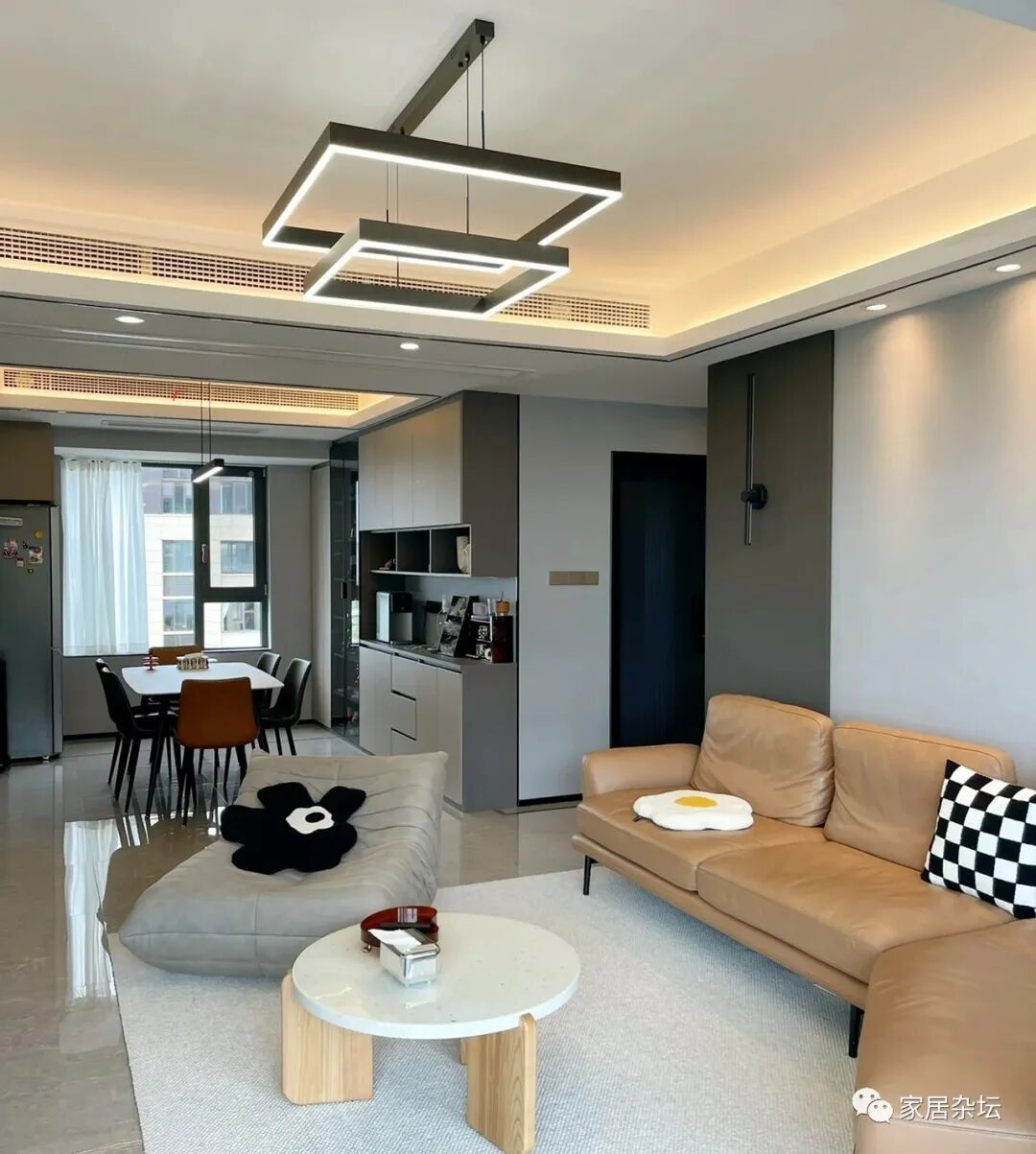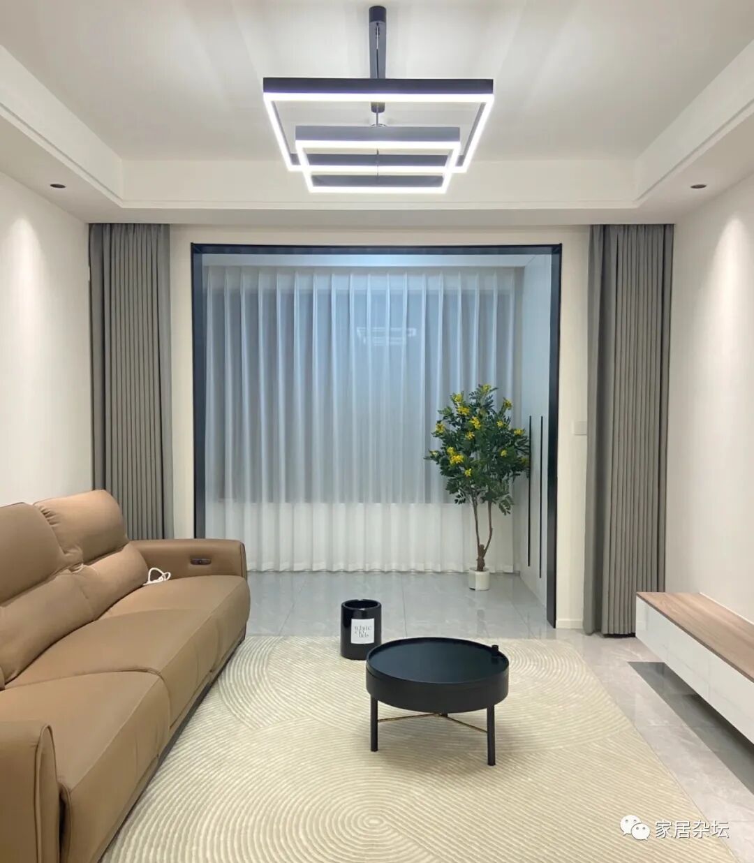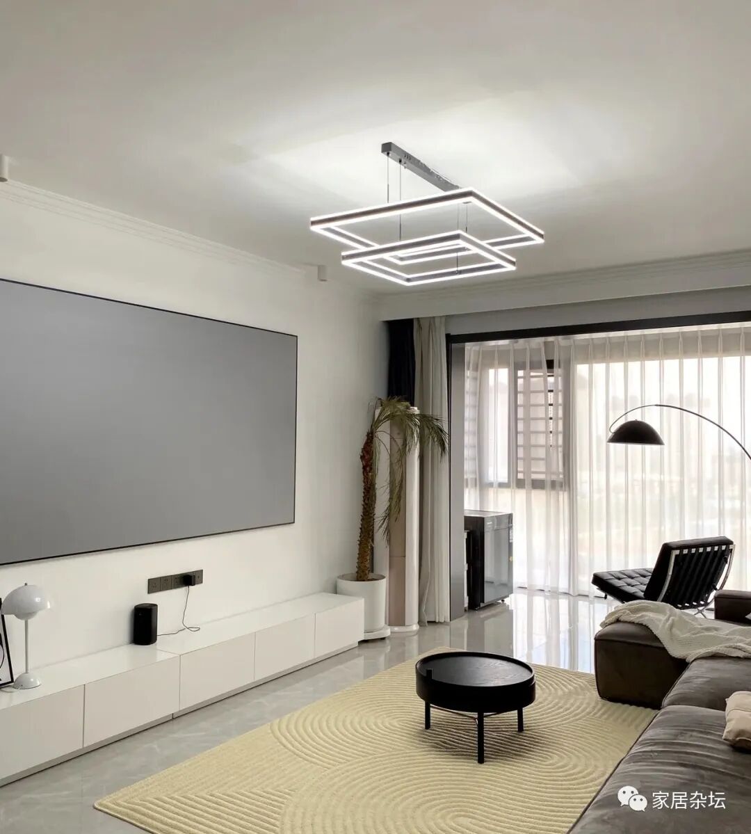 ③、对于客厅而言,可以选择吸顶的极简灯具或者是简易的吊灯。前提是灯具要越简单越精致越好,千万不要选择浮夸的水晶吊灯。