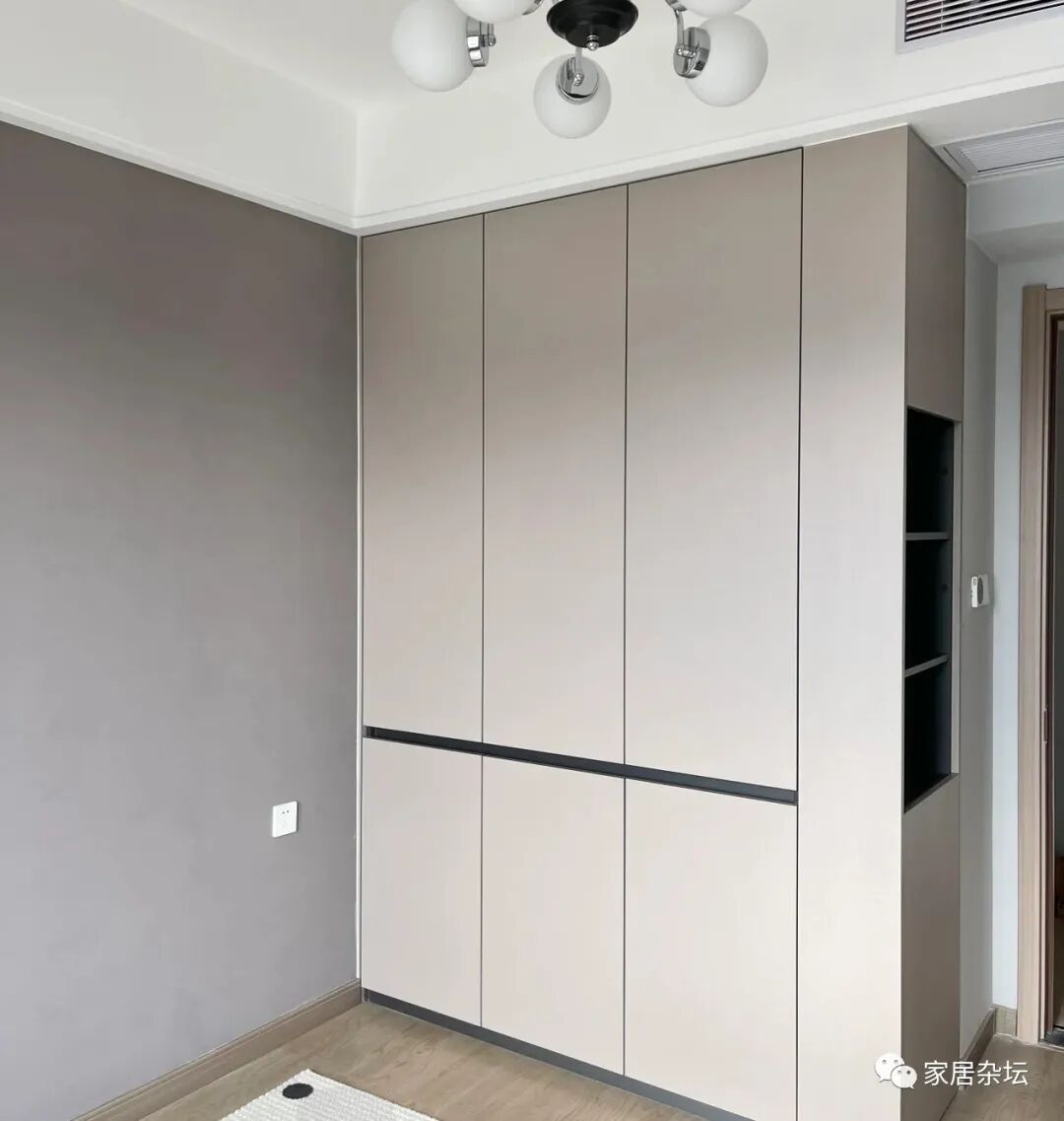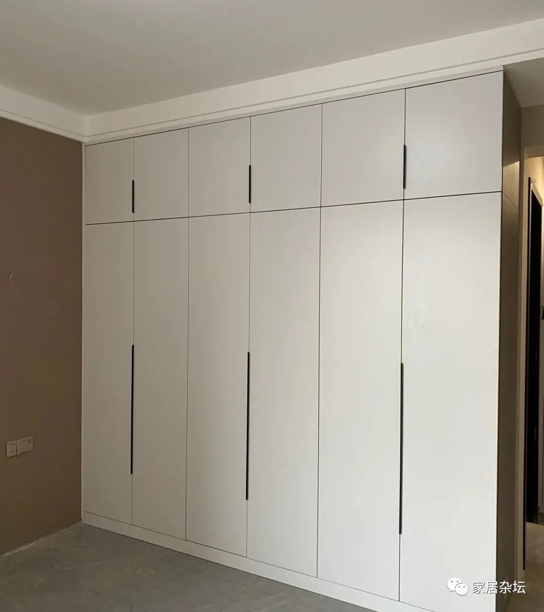 ①、对于衣柜来说,建议大家做一门到顶。衣柜都做成通体的柜门,这样既简洁大气,而且更容易多放衣服。