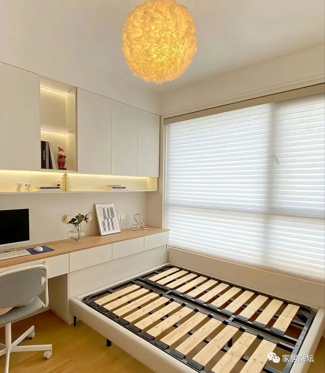 对于卧室不太大,那么考虑第二种摆放床的方案,就是床和书桌一体。