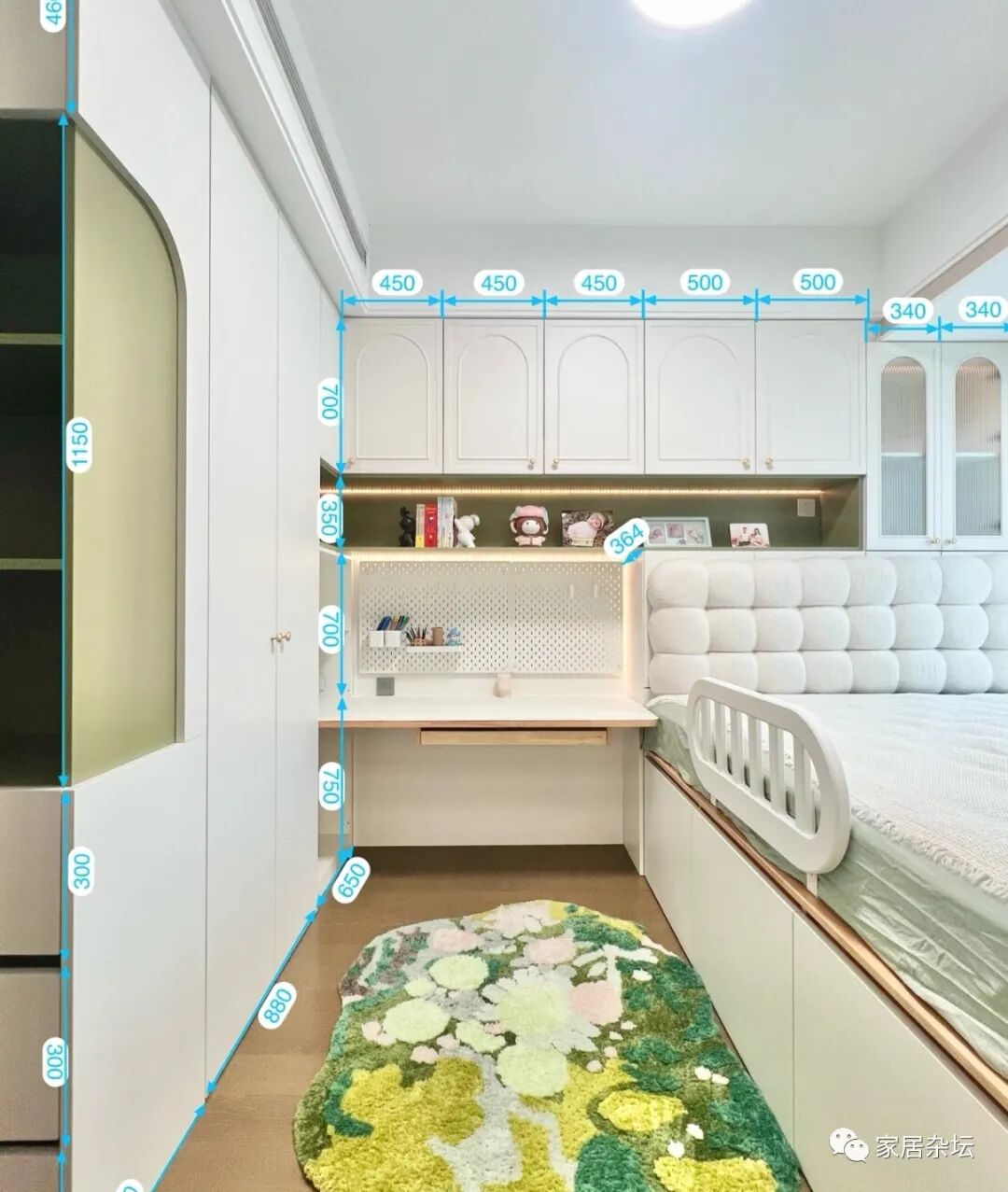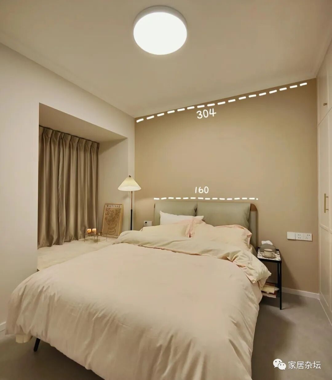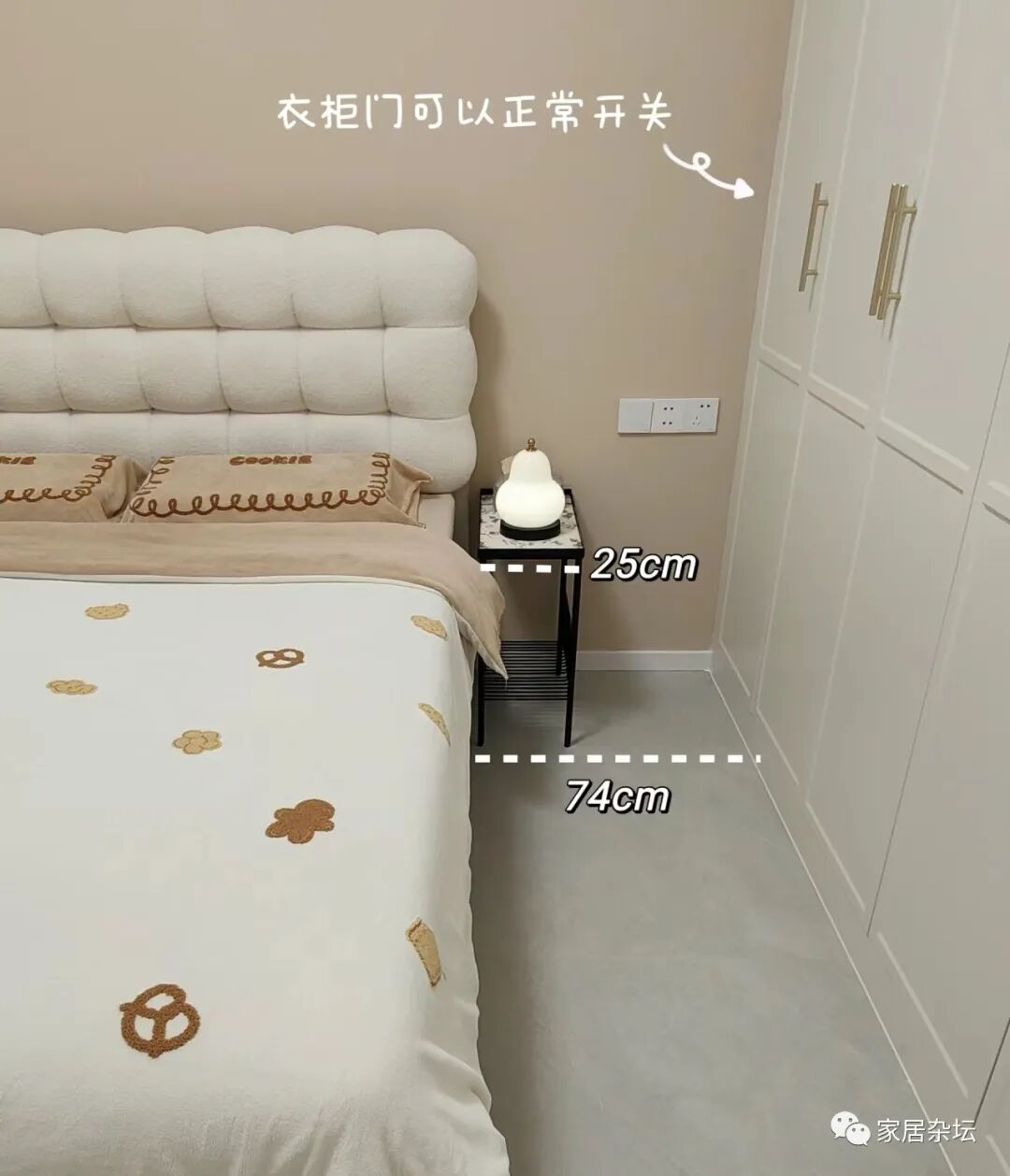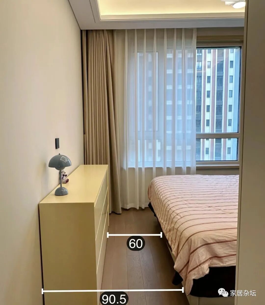 ②、卧室的床和衣柜之间有足够的距离,保证衣柜可以正常使用。因为多出来了30公分,这个尺寸加到衣柜和床之间,让衣柜门可以正常打开。