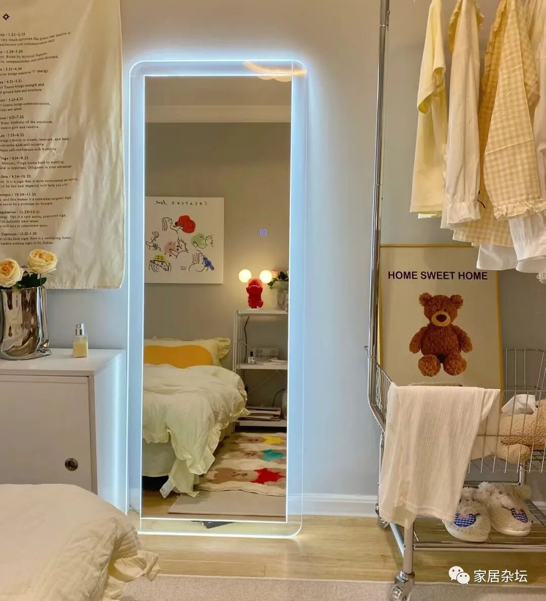 实际上常见设置在卧室的镜子的位置,有书桌或者化妆台的位置,又或者是某面墙某个位置。