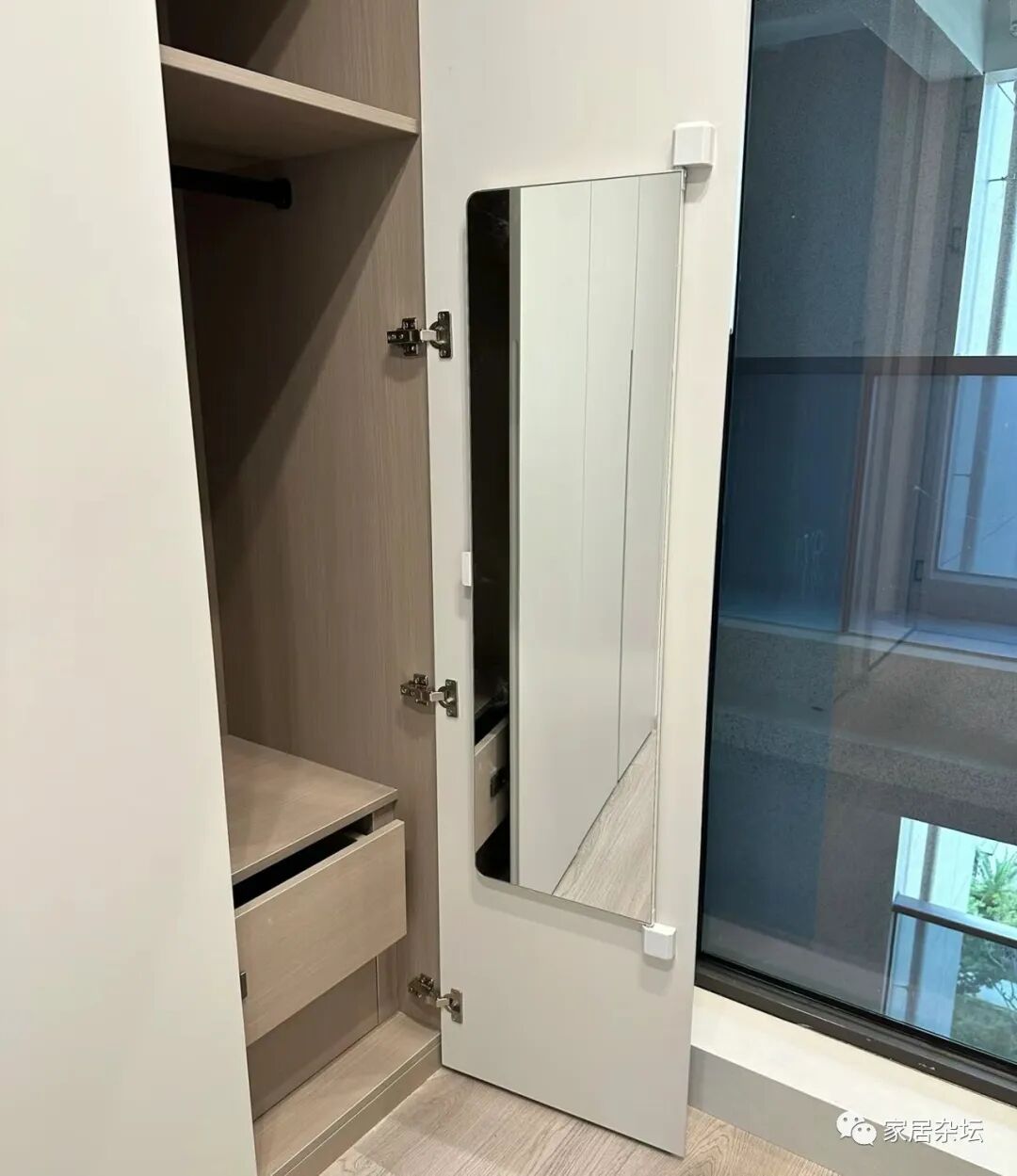 ②、如果镜子放在卧室,建议大家尽量设置成隐藏式的试衣镜镜。这种试衣镜做法还是很多的,例如可以安装在衣柜里,做成旋转隐藏式试衣镜。