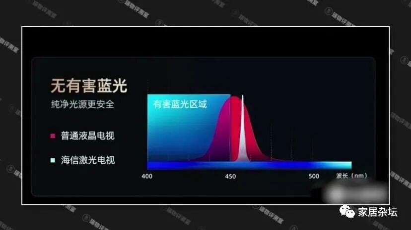 ①、在反射成像作用下,屏幕不需要通电,自然也就没有辐射问题。对于有害蓝光问题,海信L5K采用纯净激光光源,从源头避开有害蓝光波段,配合DC调光方式,黑暗中观看也是0频闪。