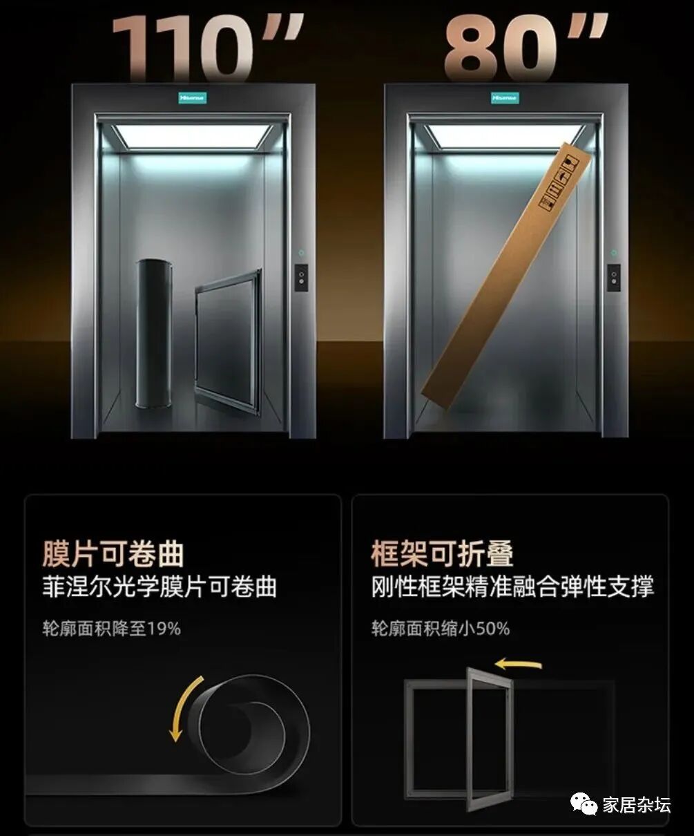 ①、电视屏幕拆分成柔性膜片和框架两个部分。膜片能够像瑜伽垫一样卷起来,框架也能180°折叠,轻松解决100英寸-120英寸电视的入梯、入户难题。