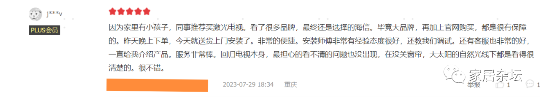 ③、当然,这些工作都不需要用户自己操心。你只需一键下单,购买海信激光电视L5K,就能享受全流程管家式的九星级SVIP服务,勘测、安装、调试都由海信免费包揽。同时,还有5年超长保修期,网上评价也不错呢。
