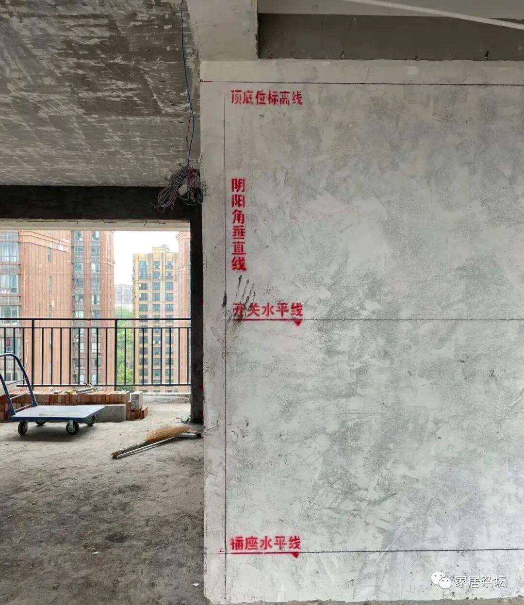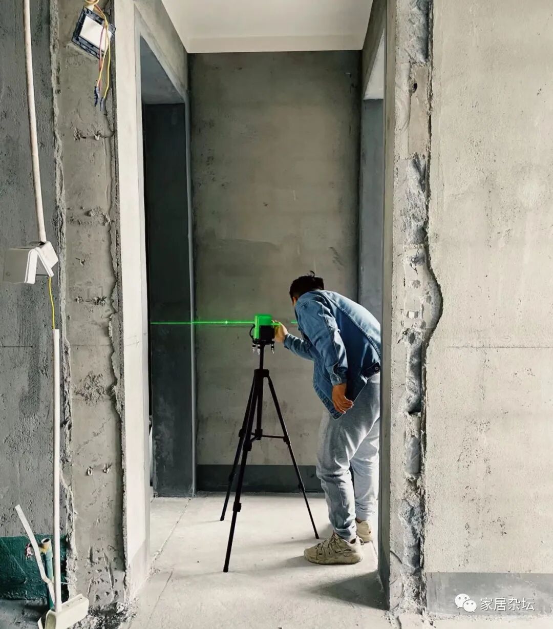 ①、使用水平红外仪测量墙面平整度和垂直度。其误差要接近于5毫米以内。