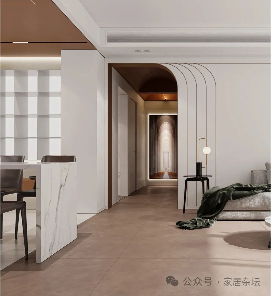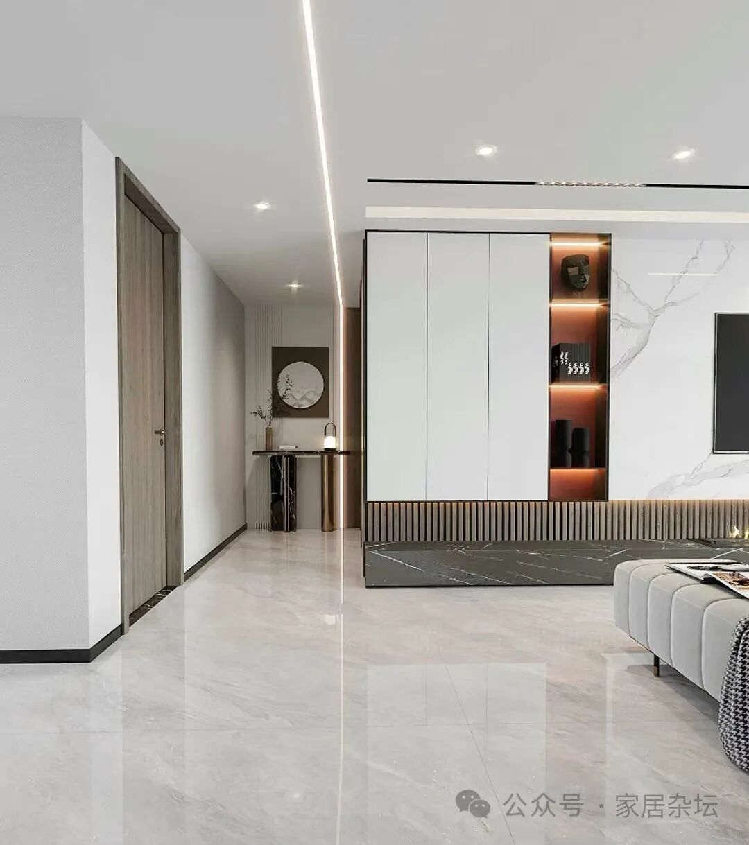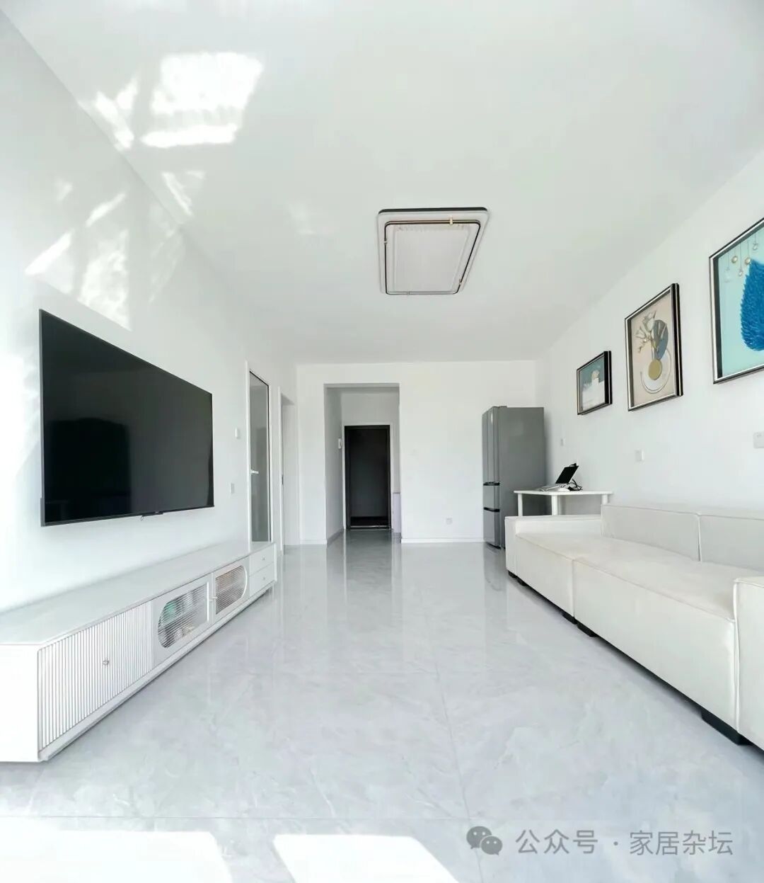 ①、站在门口放眼望去,整体性特别好。如果能够将室内的整个地面铺贴为一体,在大气方面来说,是非常好的一种表现。