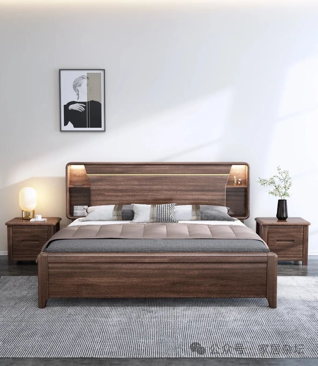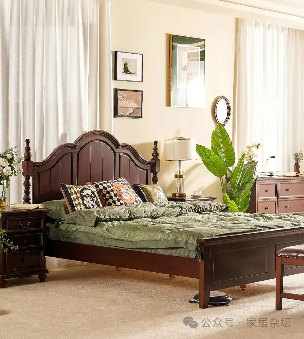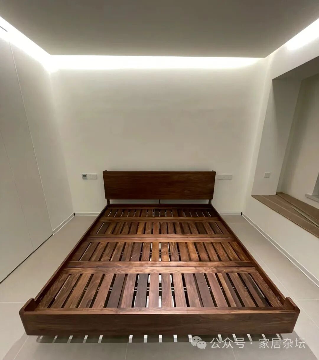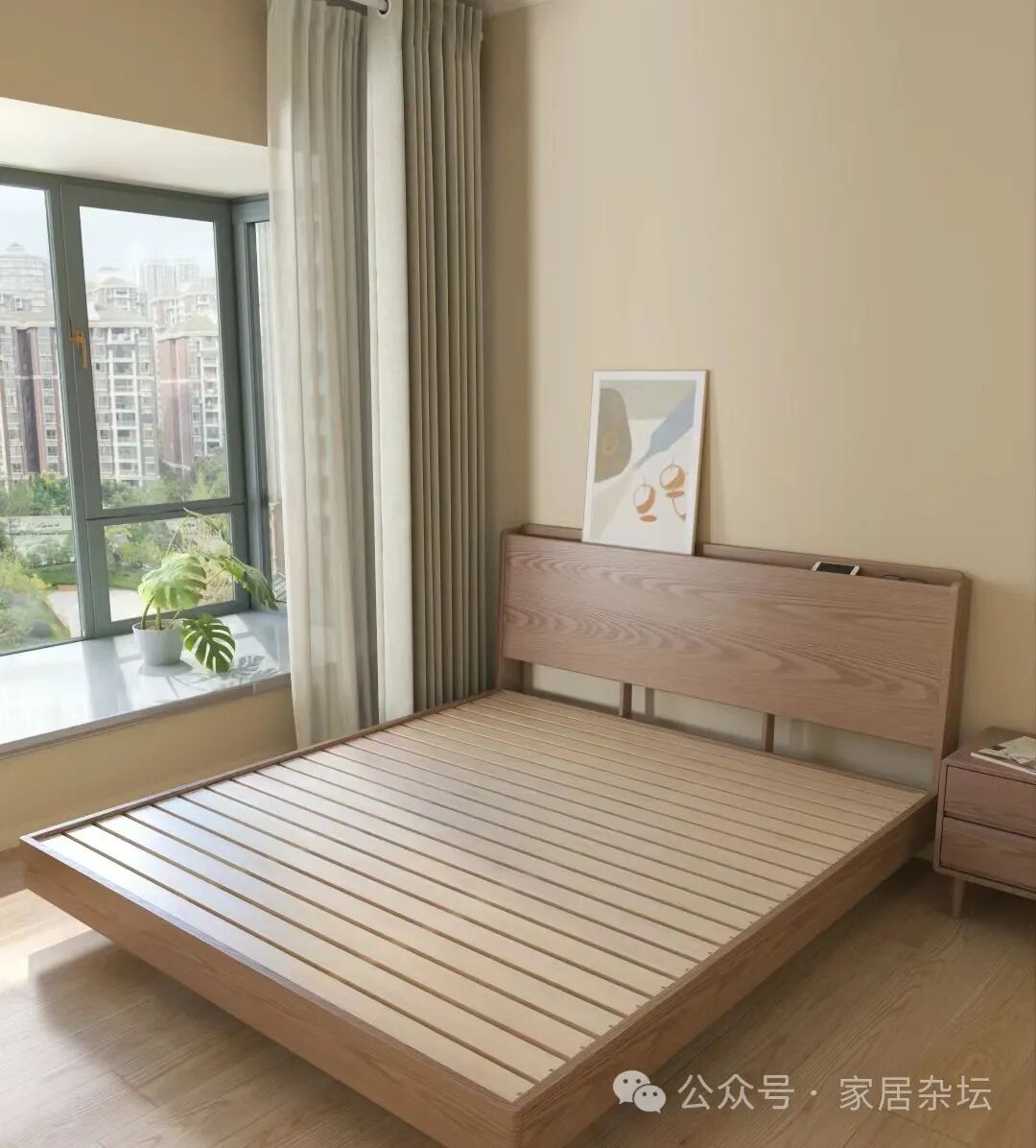②、选实木床的时候,床头尽量要有床头板。这样我们后期好搭配,而且用的会更舒服一些。