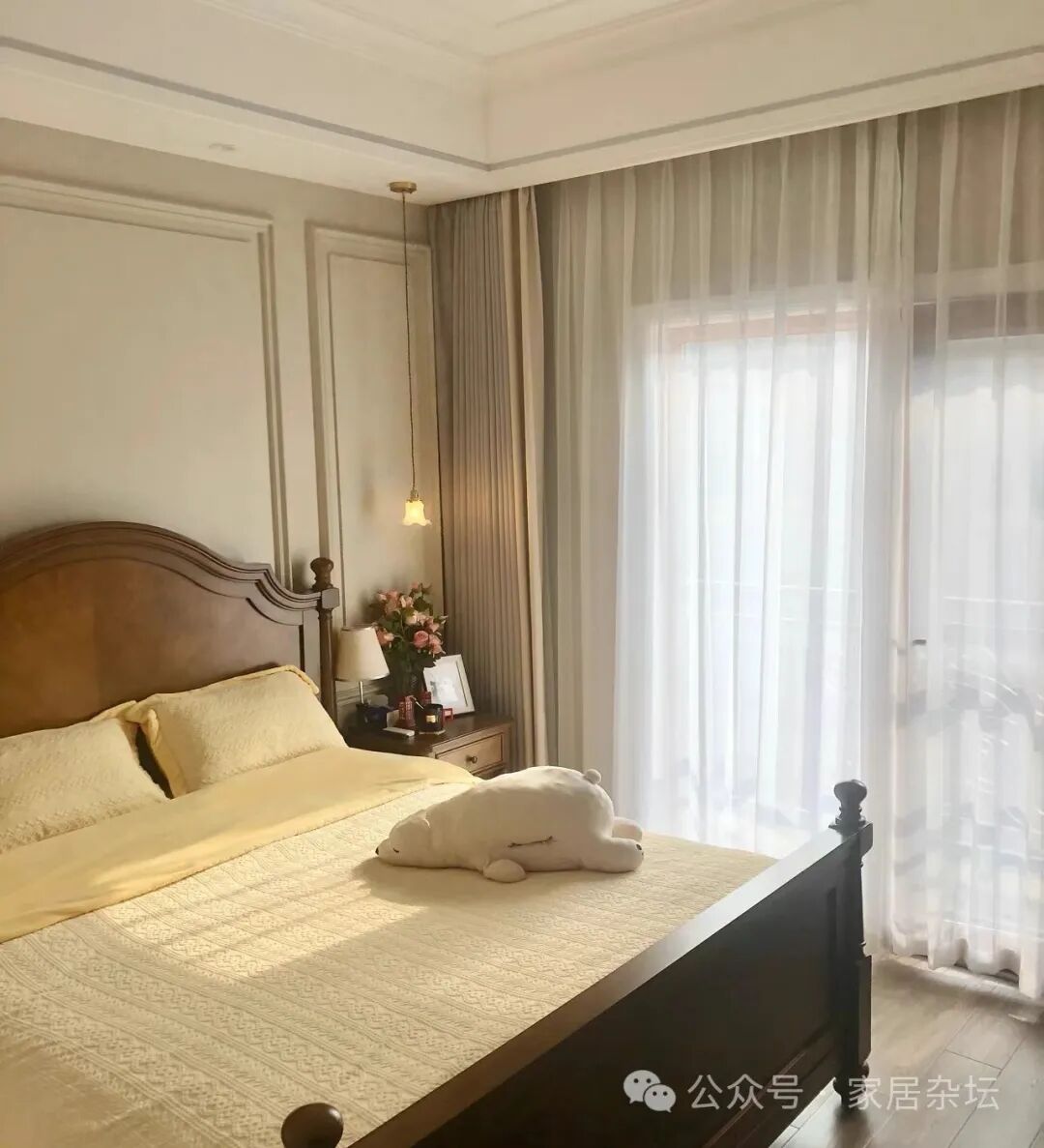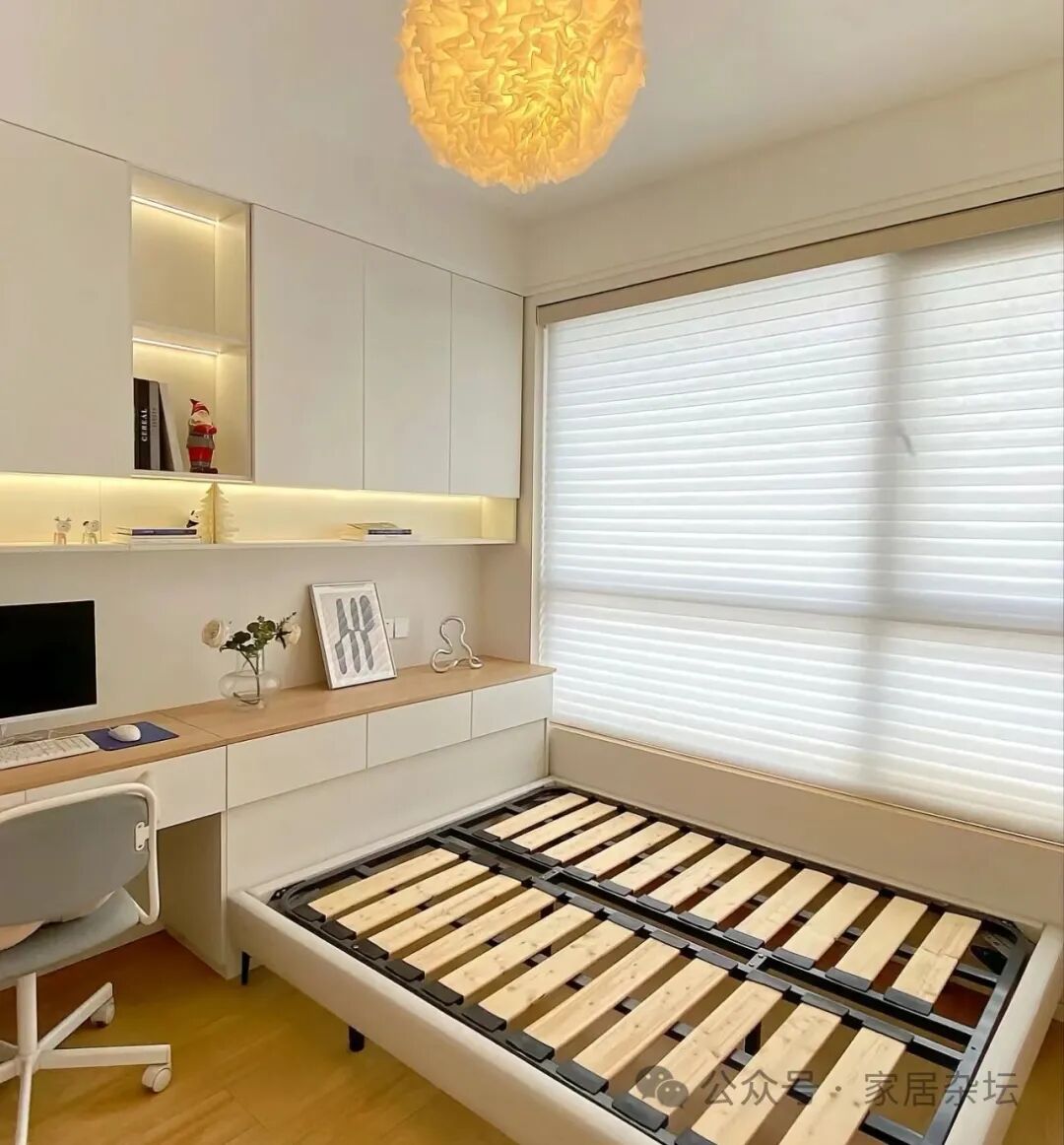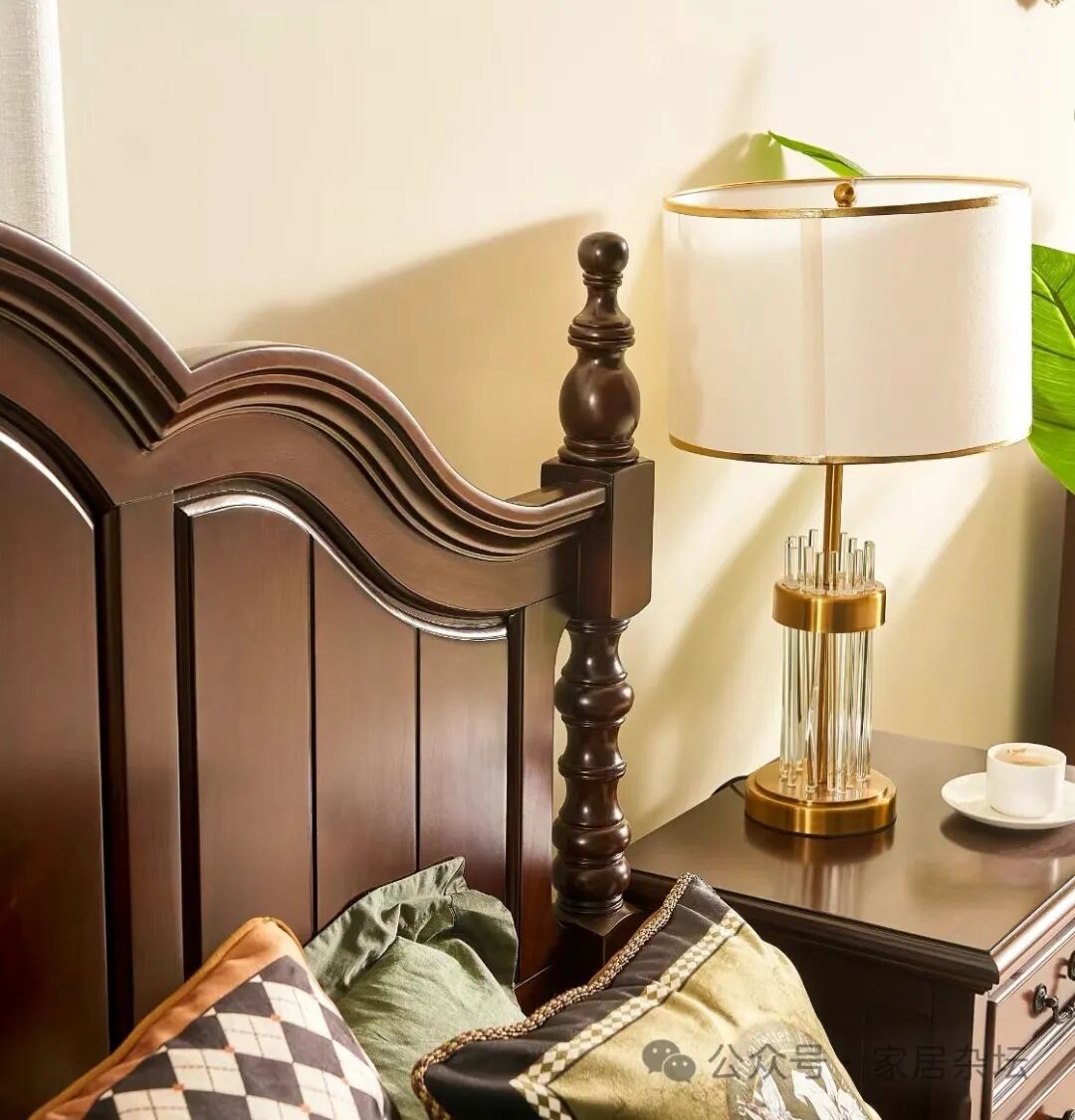 ②、选实木床的时候,床头尽量要有床头板。这样我们后期好搭配,而且用的会更舒服一些。