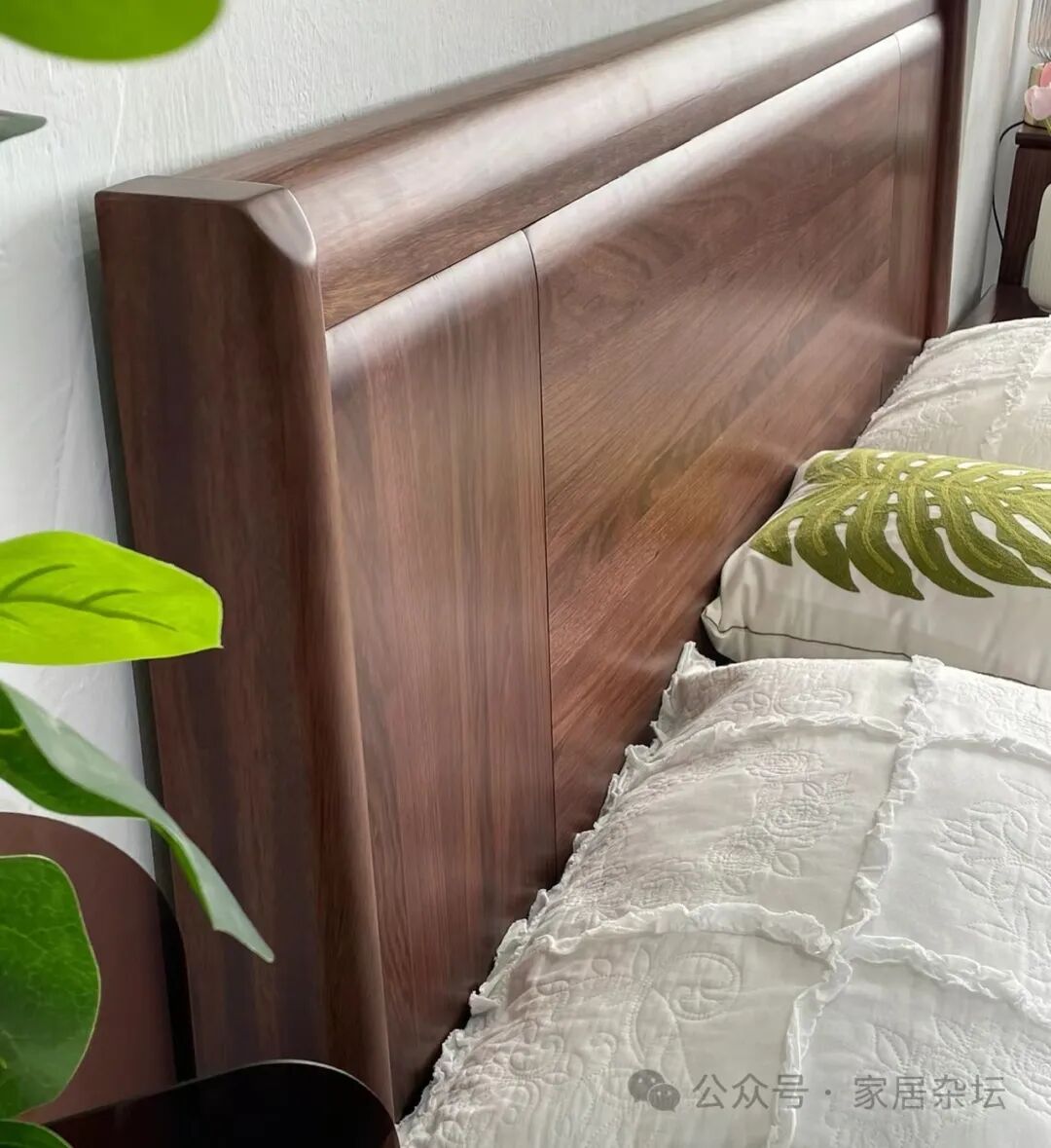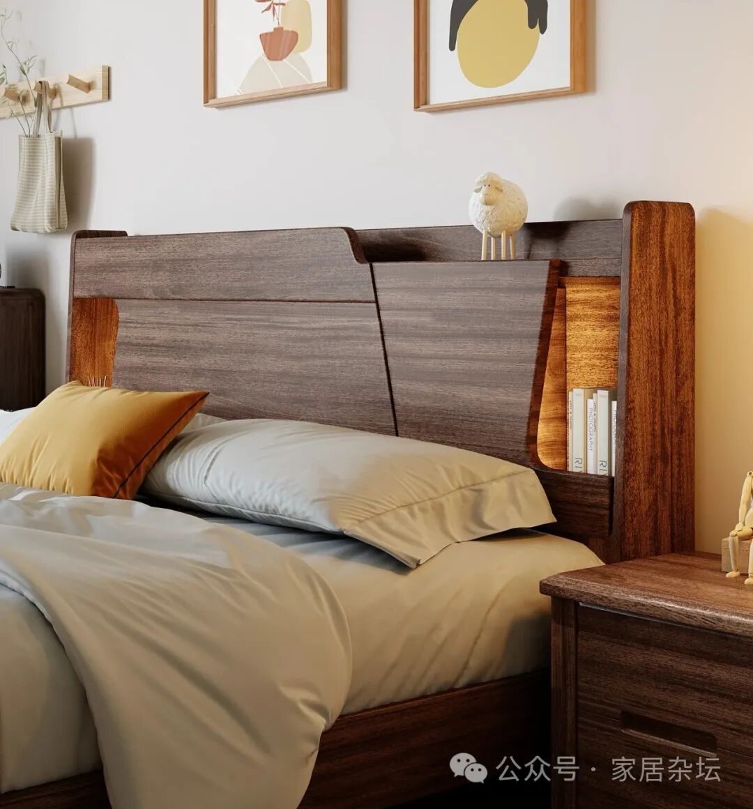 ①、选实木床的时候,床头尽量不要选择可调节的板材的实木床。如果能选择同木种的实木的床头,效果更好。