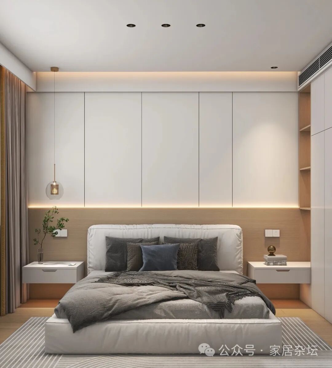 ①、考虑单边床头柜。如果我们对床头柜的需求不是很大,那么可以考虑在单侧放一个床头柜,也就是一个床头柜。一个床头柜,基本上满足了一个卧室的使用需求。