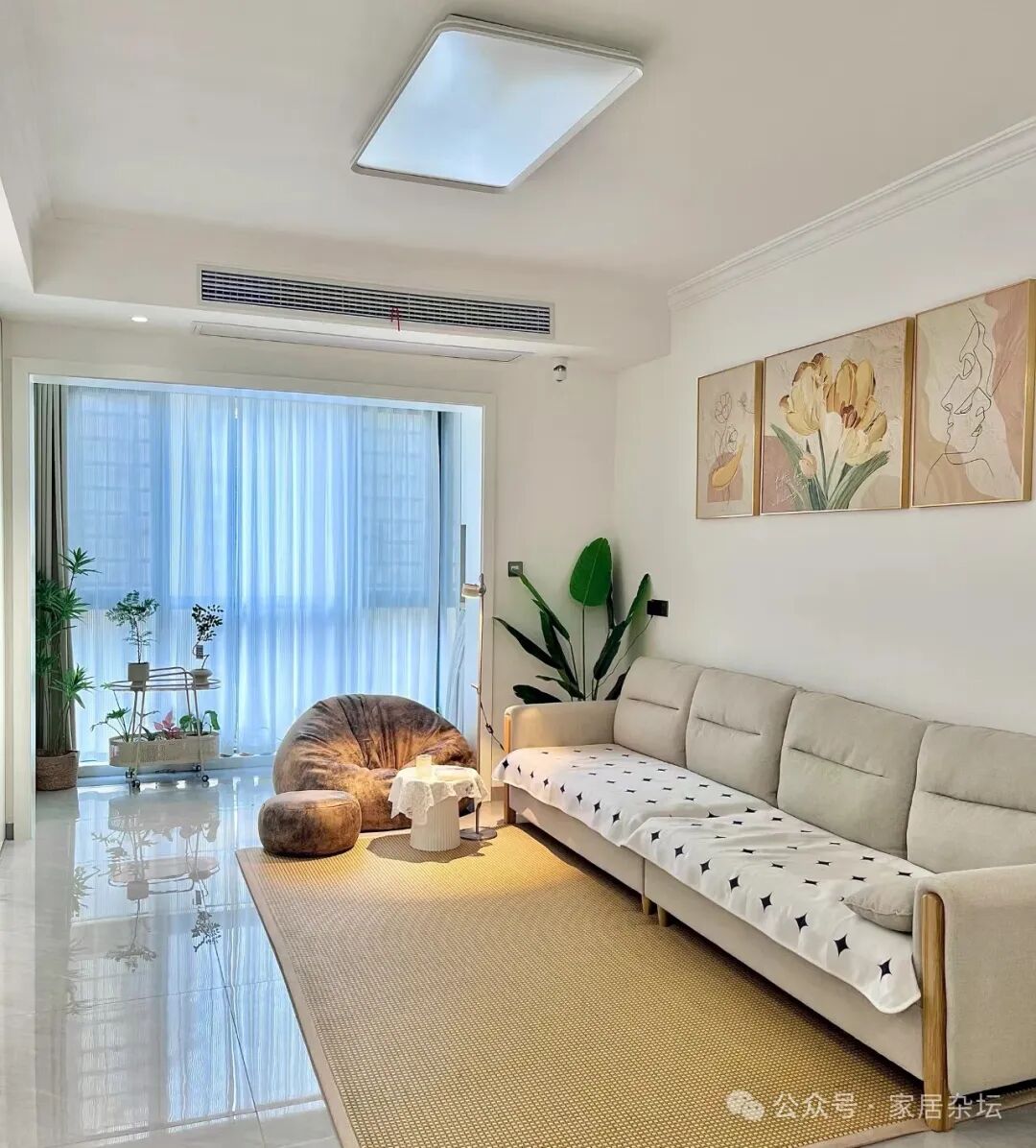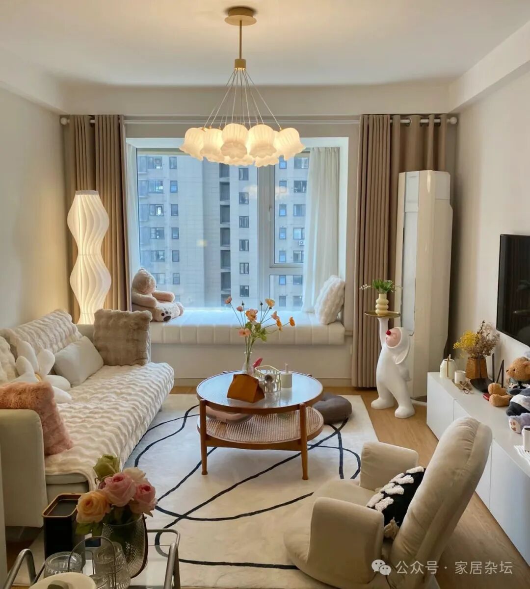 ②、布置方案。个人给出的布置方案,就是选择可活动的小茶几,然后配上极简的电视柜,让客厅尽可能的空旷起来。