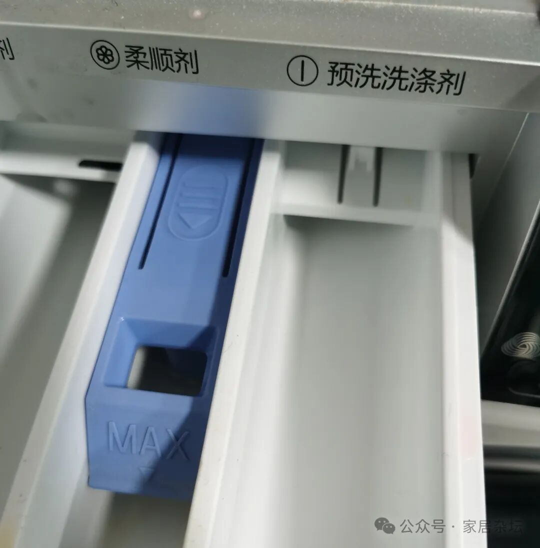 对于洗涤剂格子里的洗涤剂,建议大家不要加太多。无论是主洗涤剂或者是预洗洗涤剂,一般最多加到2/3;而柔顺剂,有个最大上限,一般不要超过这个最大刻度线。