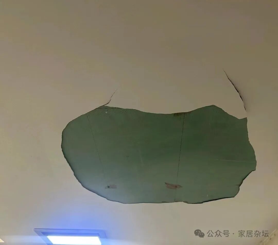②、表层乳胶漆腻子脱落,石膏板坍塌。如果长期受潮,你会发现整层的腻子层带着乳胶漆就掉下来了。严重了,石膏板可能就变形坍塌。