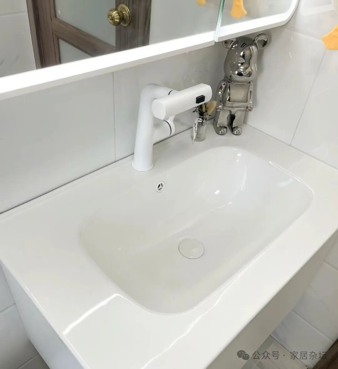 ①、对于卫生间的洗脸盆,建议大家首选的是陶瓷一体盆。不仅耐用,而且不会存在发霉变黑的问题。