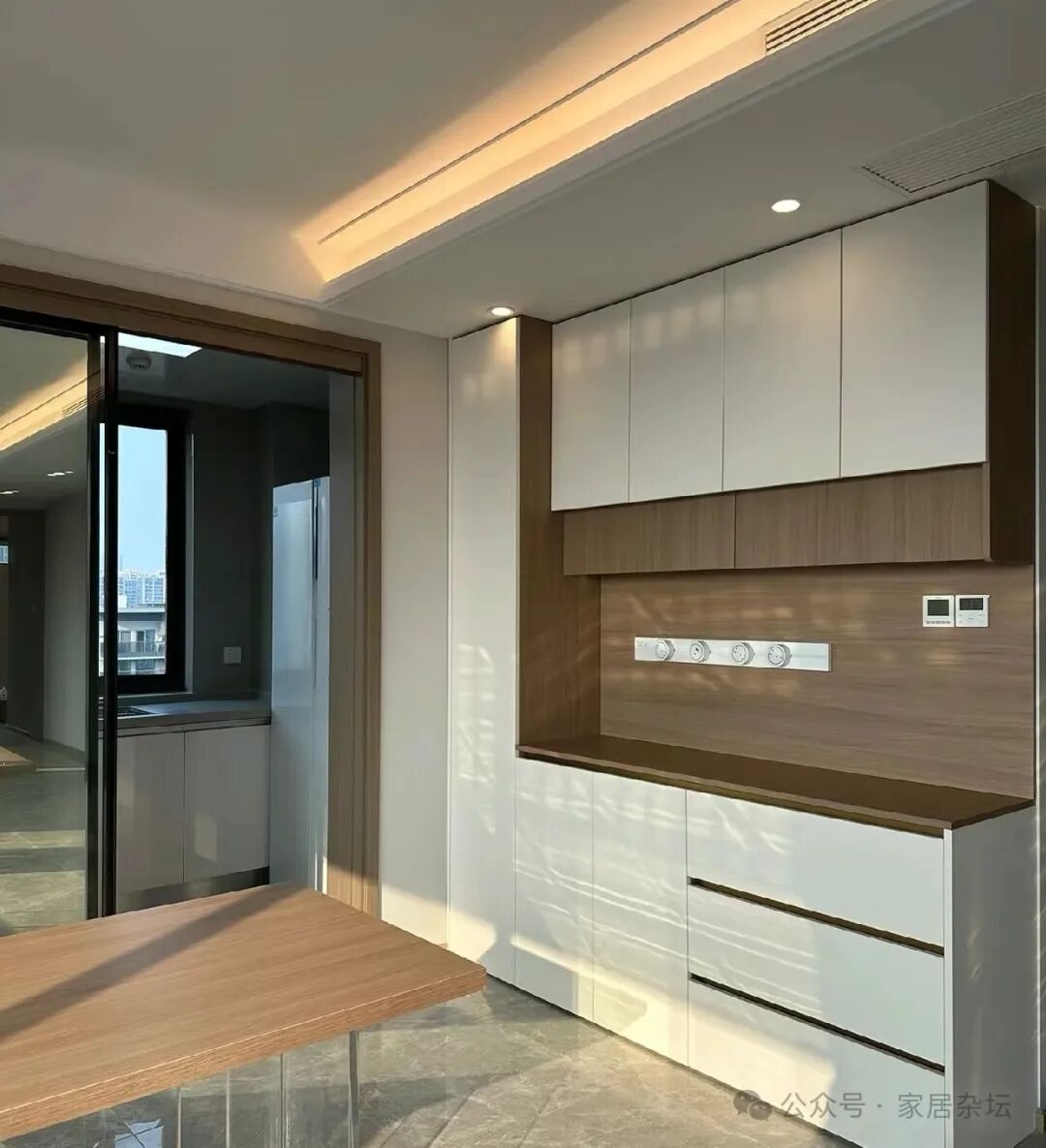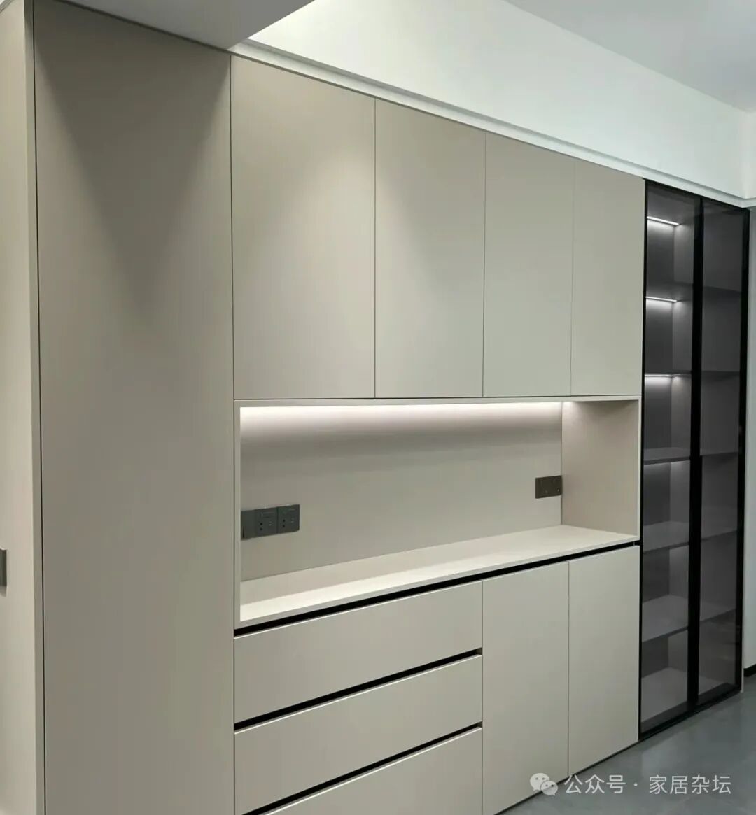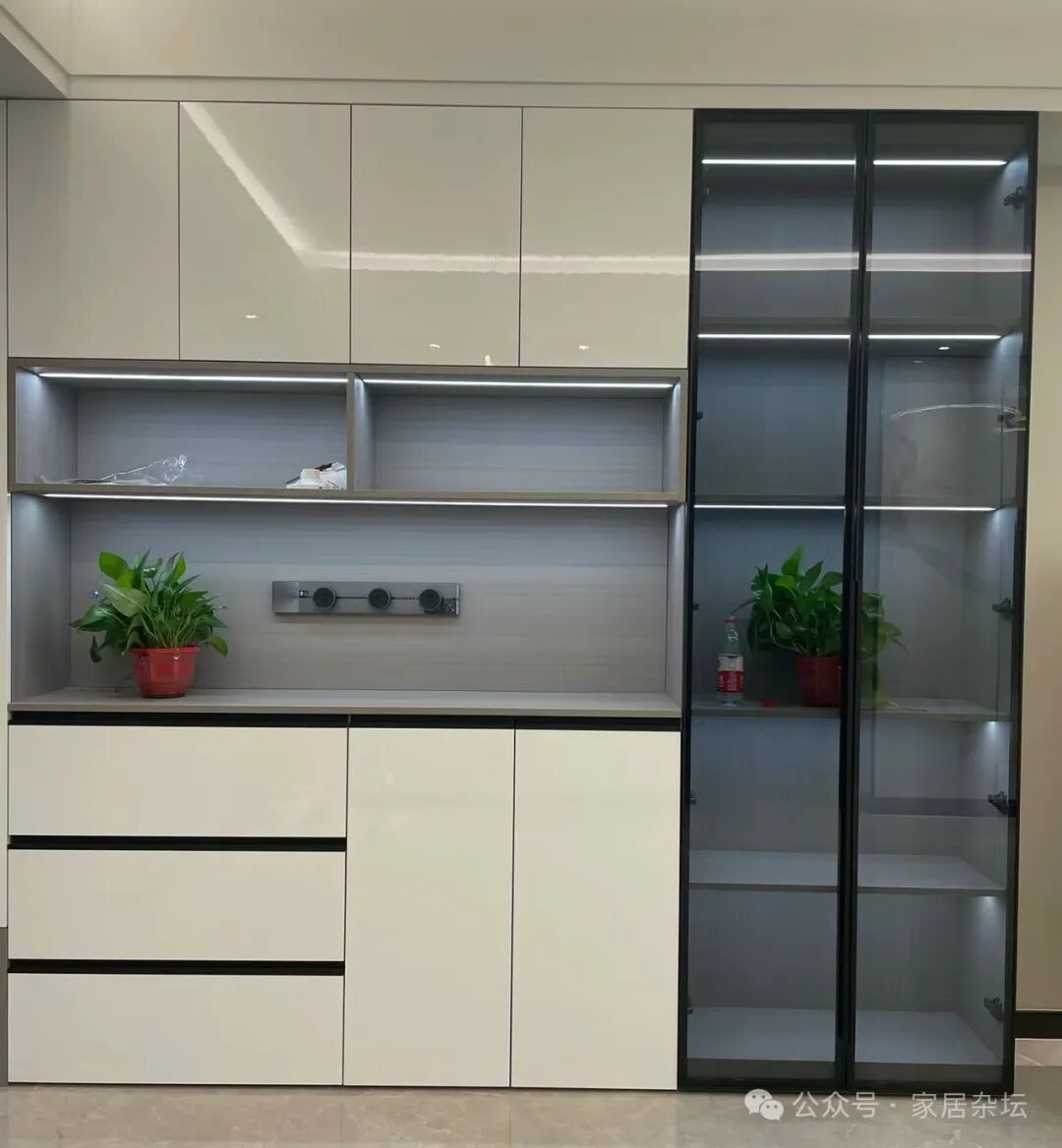 ②、对于家里一些展示区,例如放包的区域放酒的区域,可以选玻璃门。其实这些区域,玻璃柜门会更好看,因为内部比较整齐。