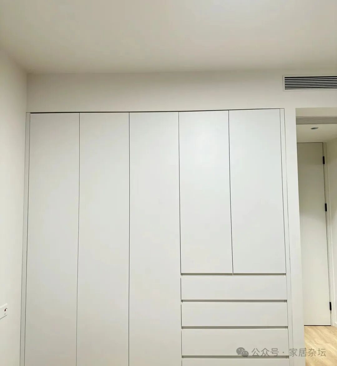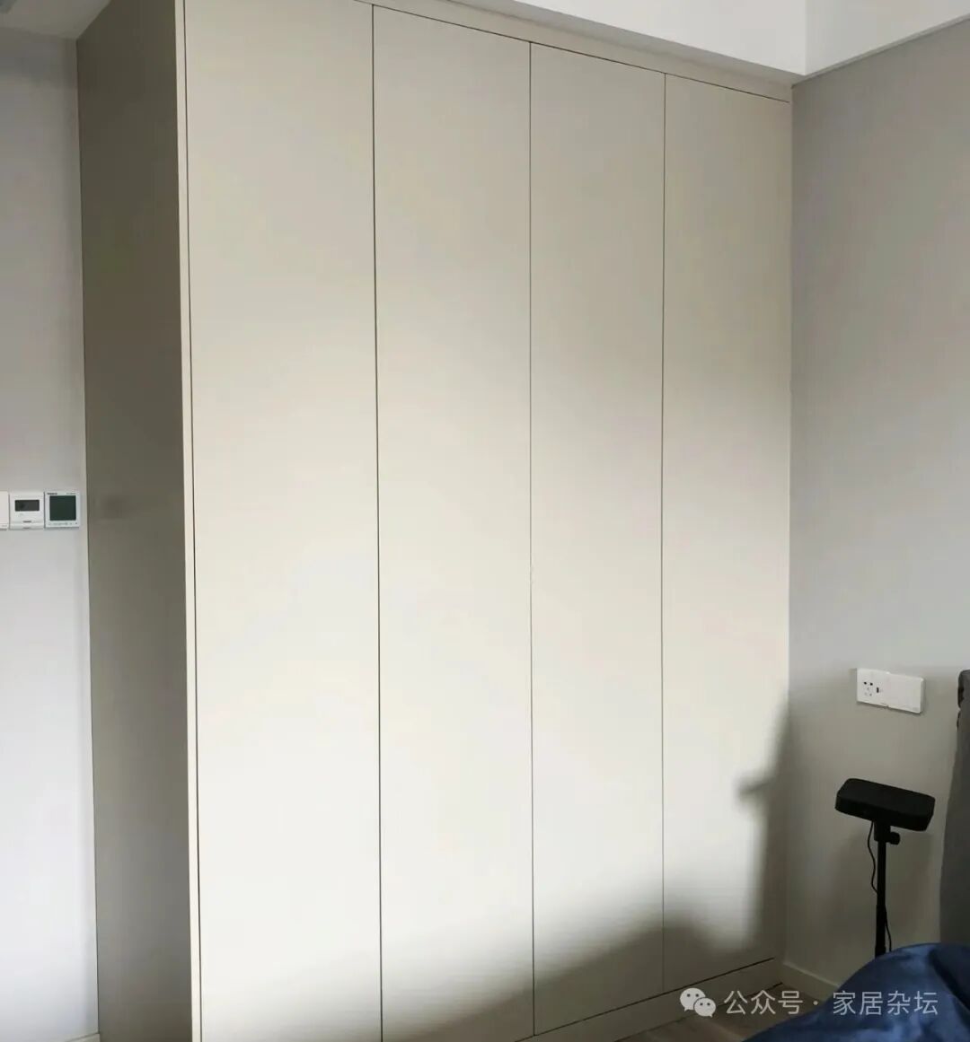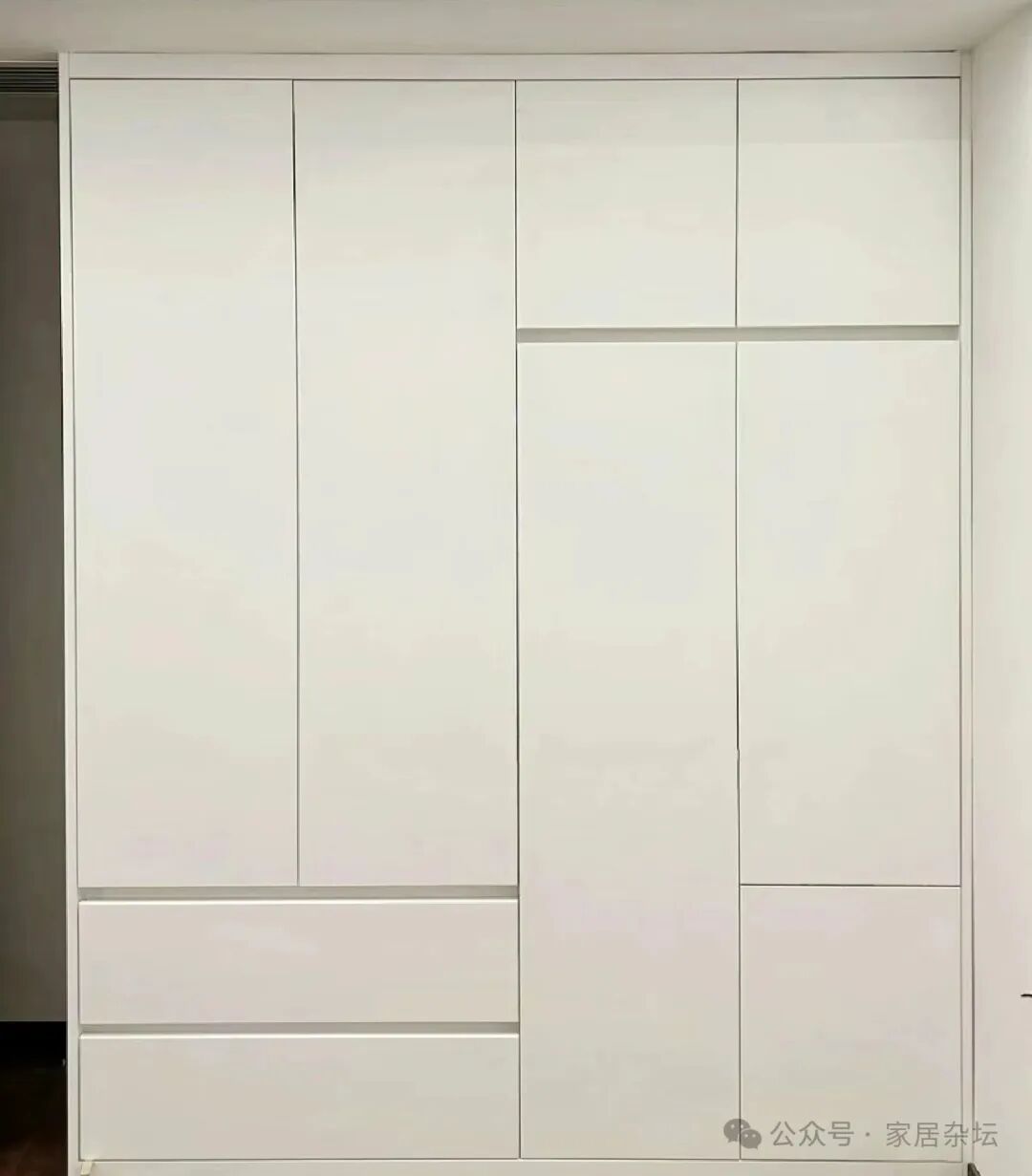 ①、如果选择普通的人造板材,尽量不要选择一门到顶衣柜。因为一门到顶的柜子,即使安装了拉直器,时间长了,还可能会出现变形而导致柜门关不上。