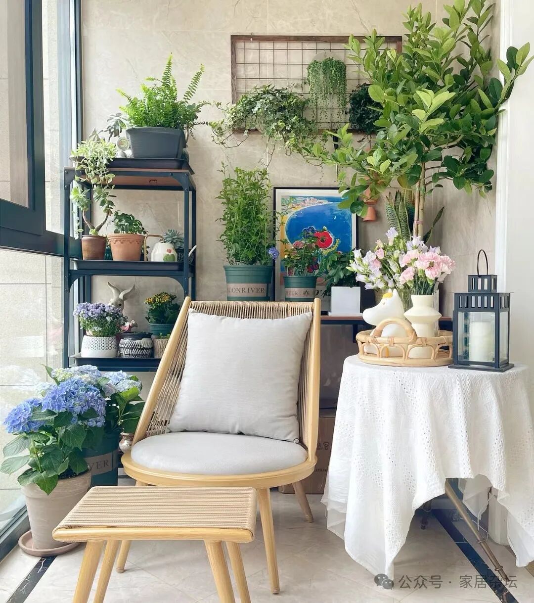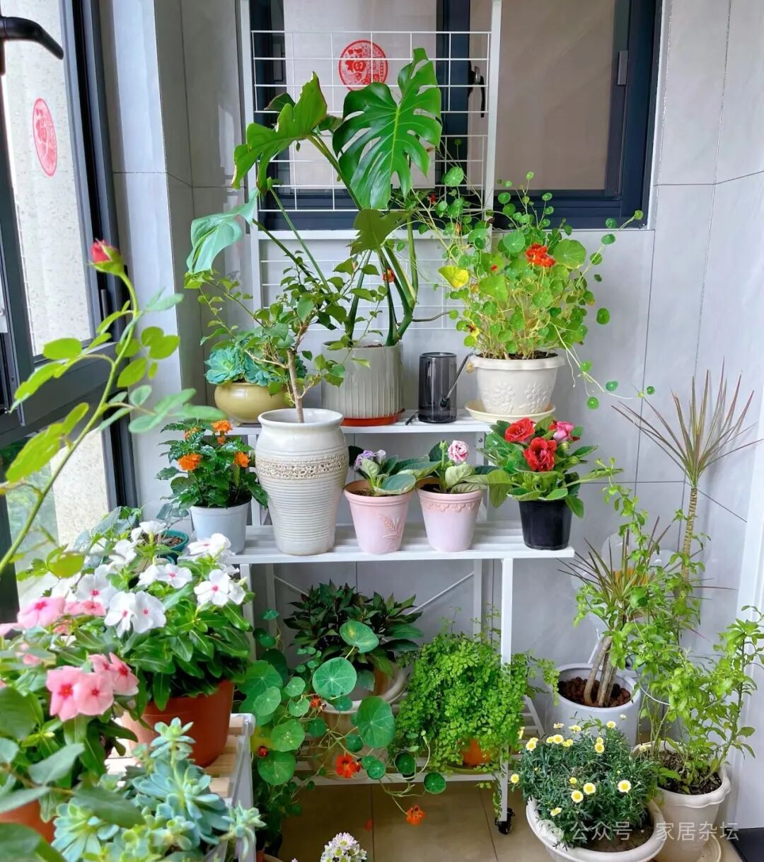 ①、合理的设置花架,分层布置。让我们的阳台,有更多的摆放绿植、摆放花的空间。