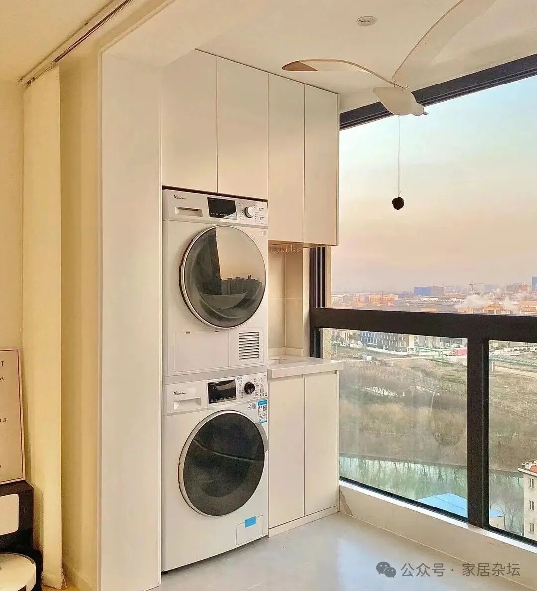 ①、在阳台洗衣区配备了烘干机。如果我们阳台有洗衣机,那么在洗衣机旁边再专门配一台烘干机,这样可以配套使用。
