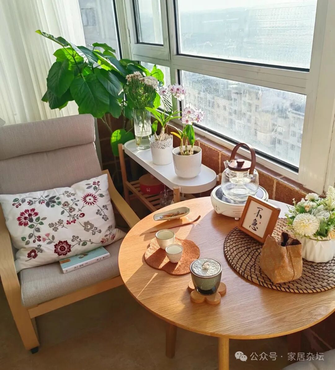 ①、在阳台布置一个简单的小桌子和一把舒适的椅子。这样一个简单的休闲阳台,就出现在我们家里了。