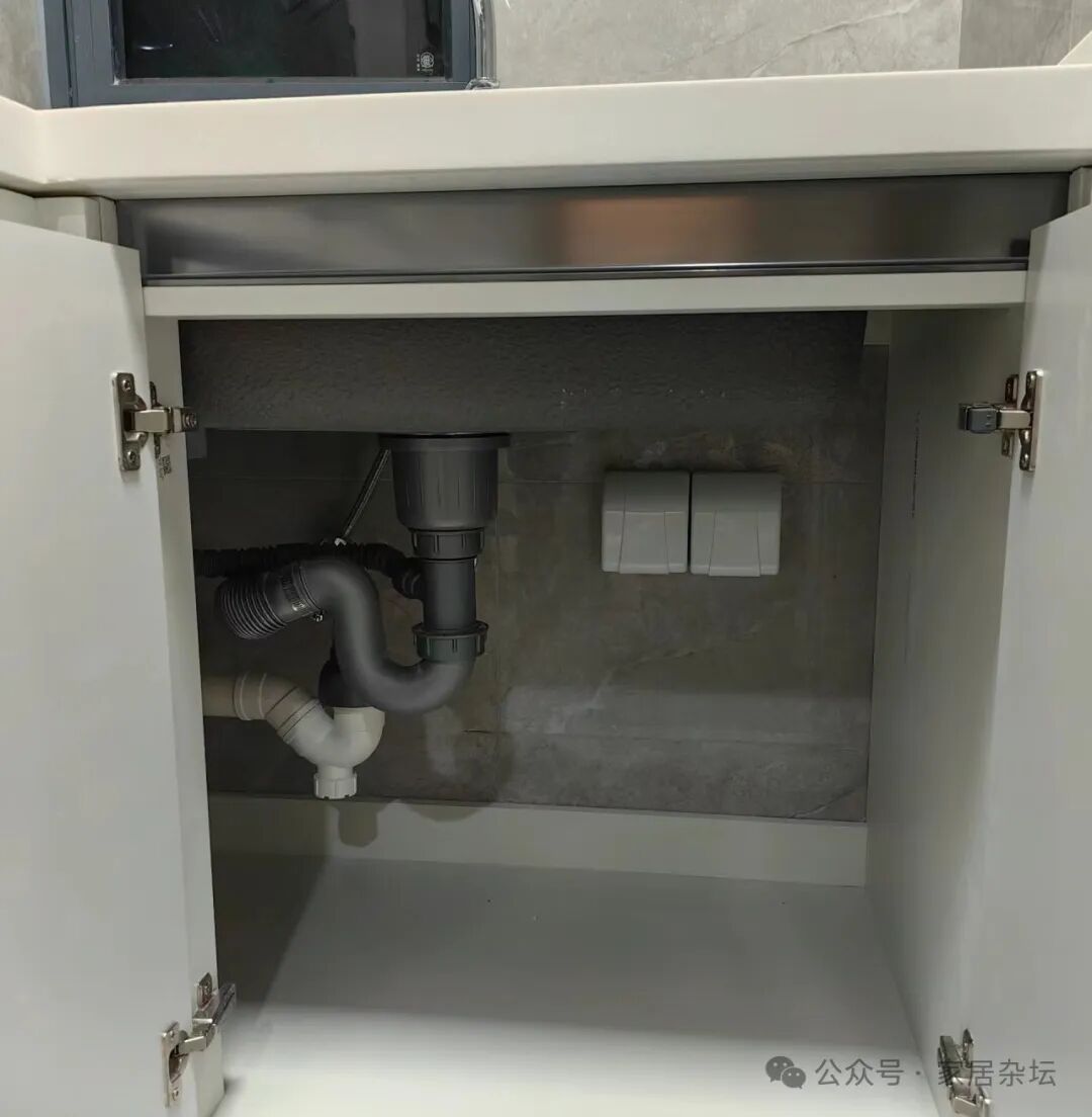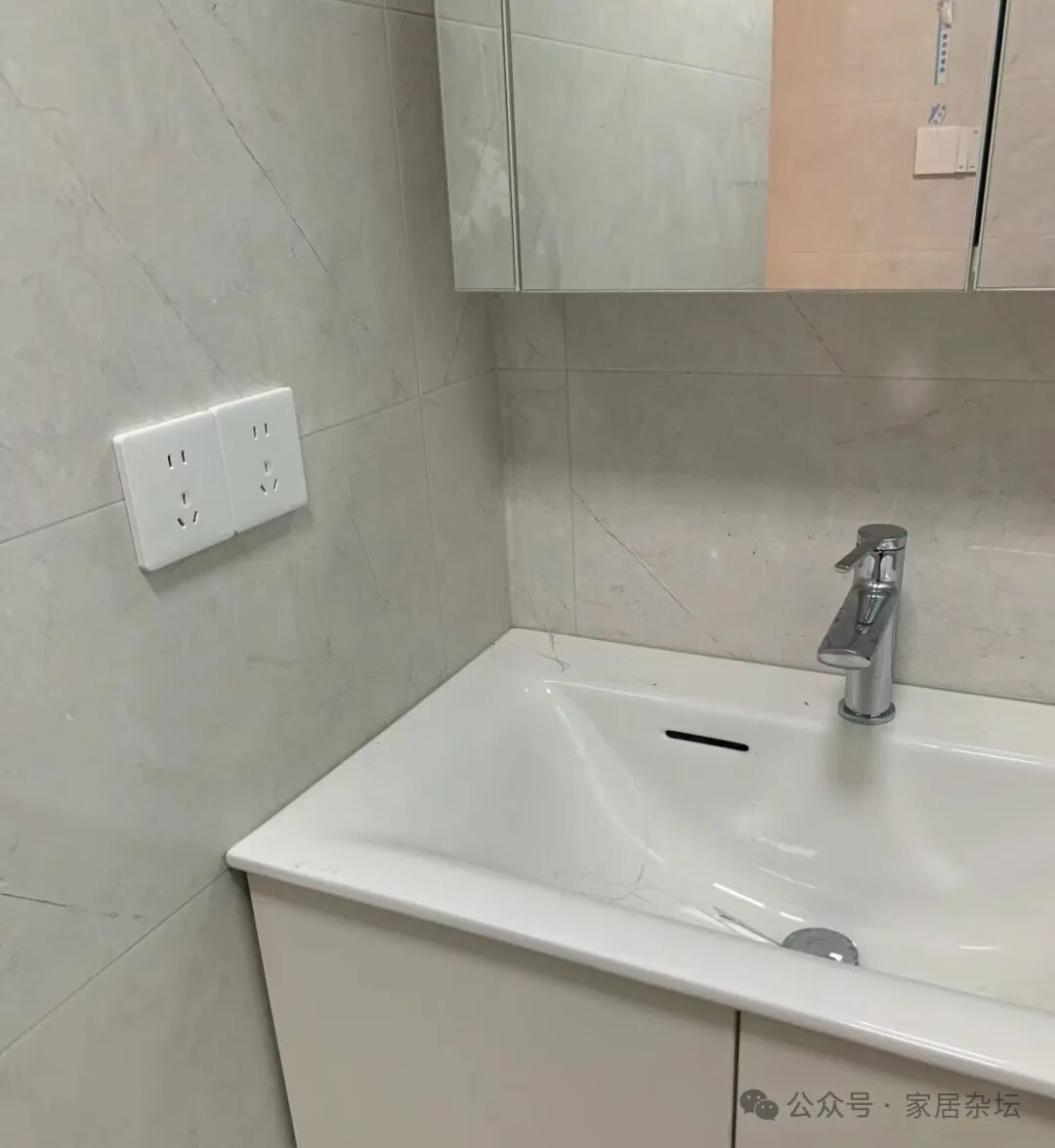 ②、水槽台面旁边预留的插座,没有考虑镜柜。这就导致安装镜柜以后将插座正好遮挡,甚至插座完全挡住,没法使用。