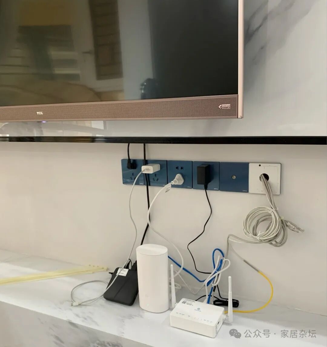③、电视机的插座,路由器的电源线,电视盒子的电源线,全部放在电视柜上搅合在一起,越看越乱,越看越心烦。