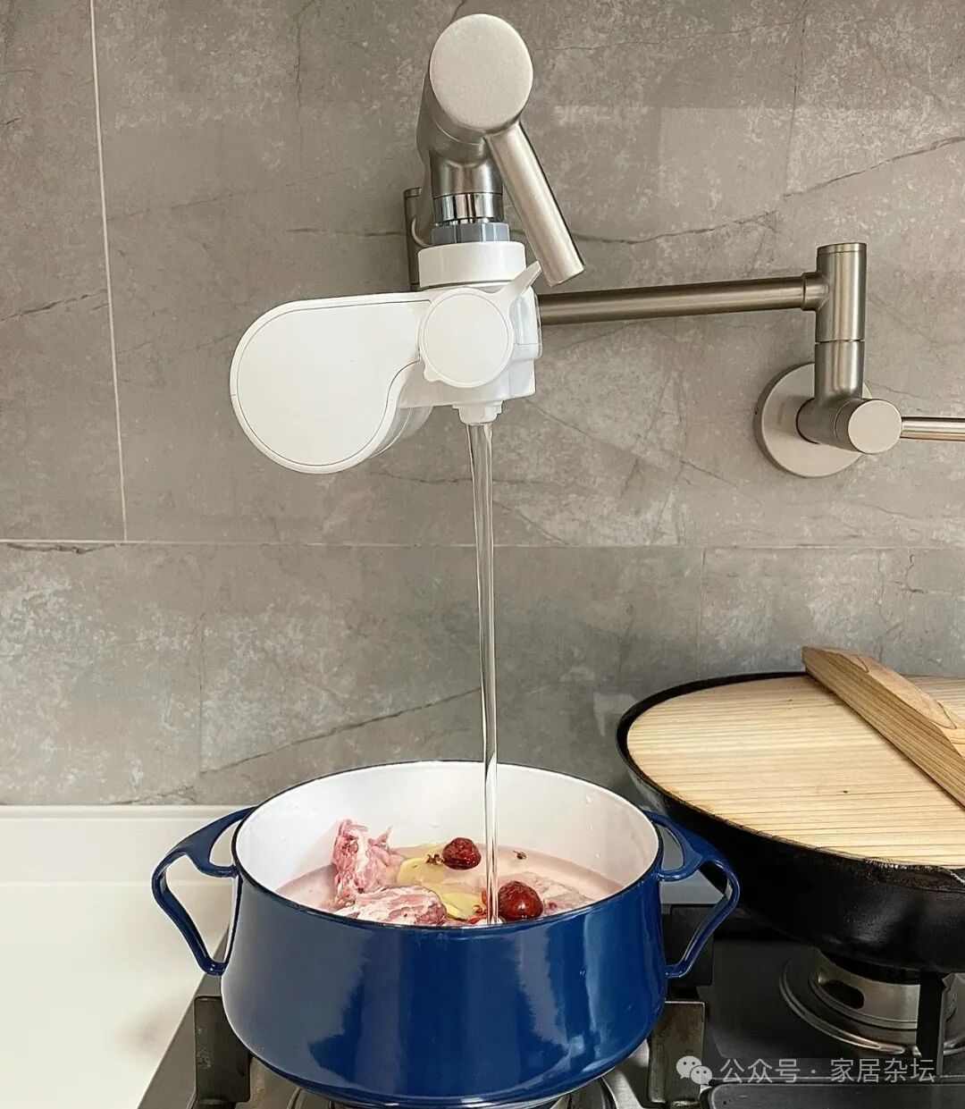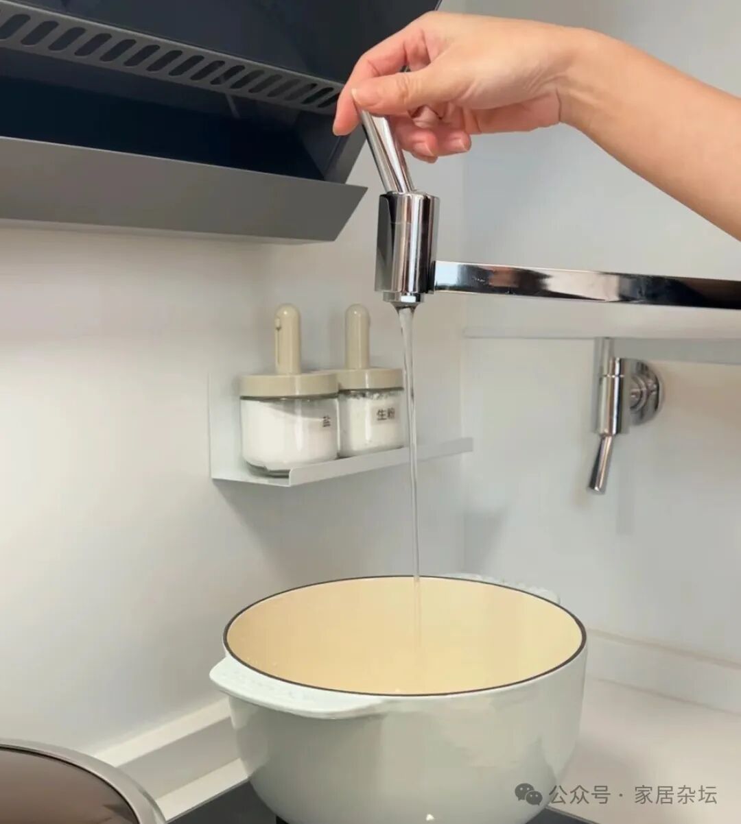 ①、在灶台后面的墙上,安装一个旋转式的水龙头。平时不用的时候,可以将水龙头旋转到贴合在墙面上;用的时候,直接旋转到灶台的正上方,打开就可以向锅里放水。