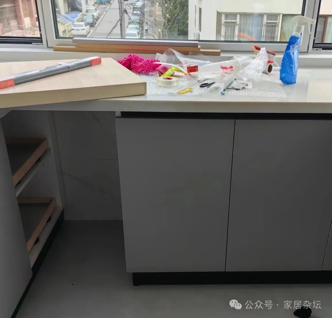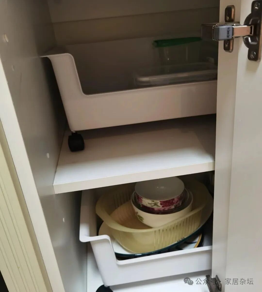 ③、如果我们担心这个镂空位置不好看,其实可以安装一个柜门。从外面看,就是把橱柜打开,里面是一个空的。